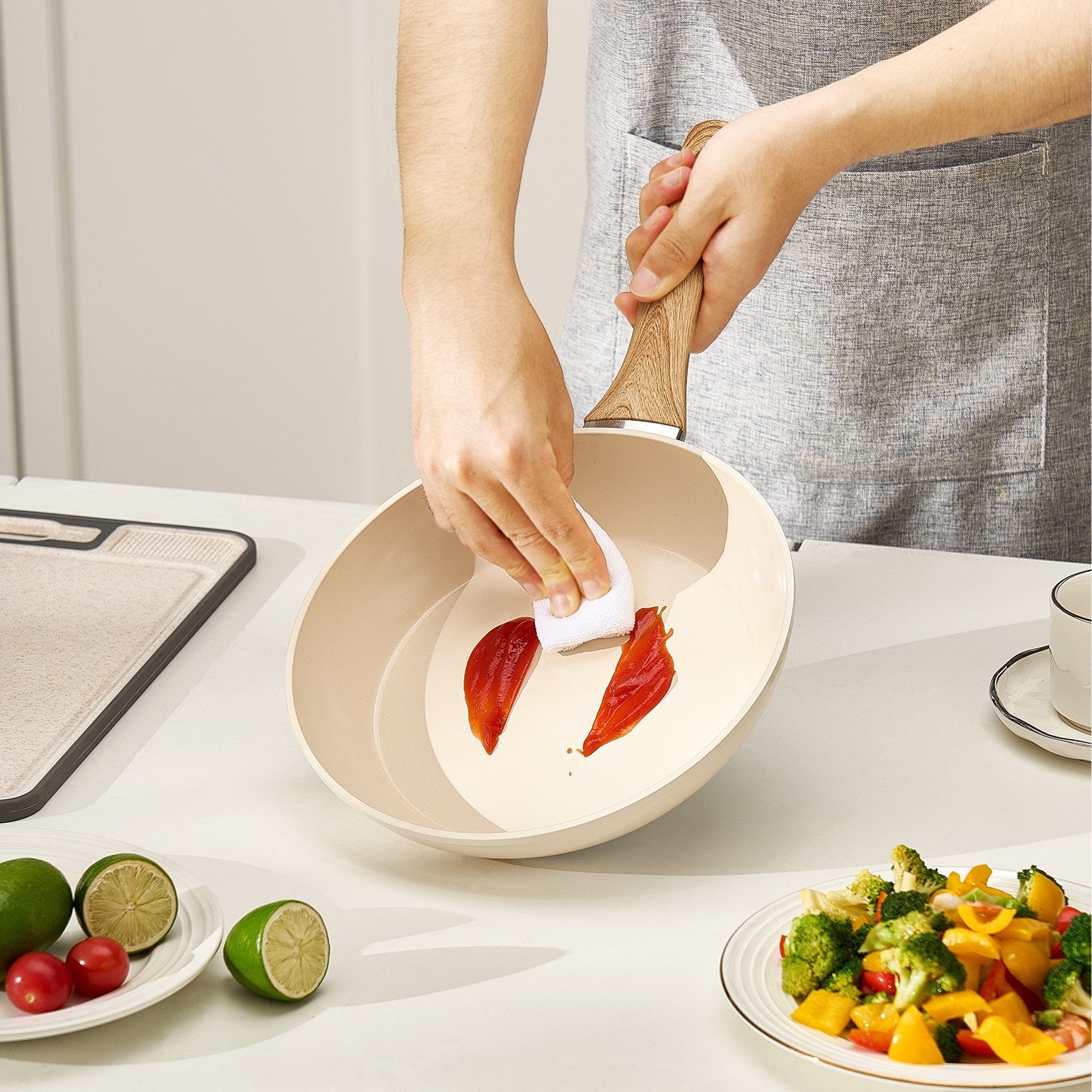 The aluminum skillet set features an ergonomic bakelite handle with heat guard, making it stay cool on the stovetop. Its water-transfer wood grain finish provides a stylish, real-wood look with a secure and comfortable grip
