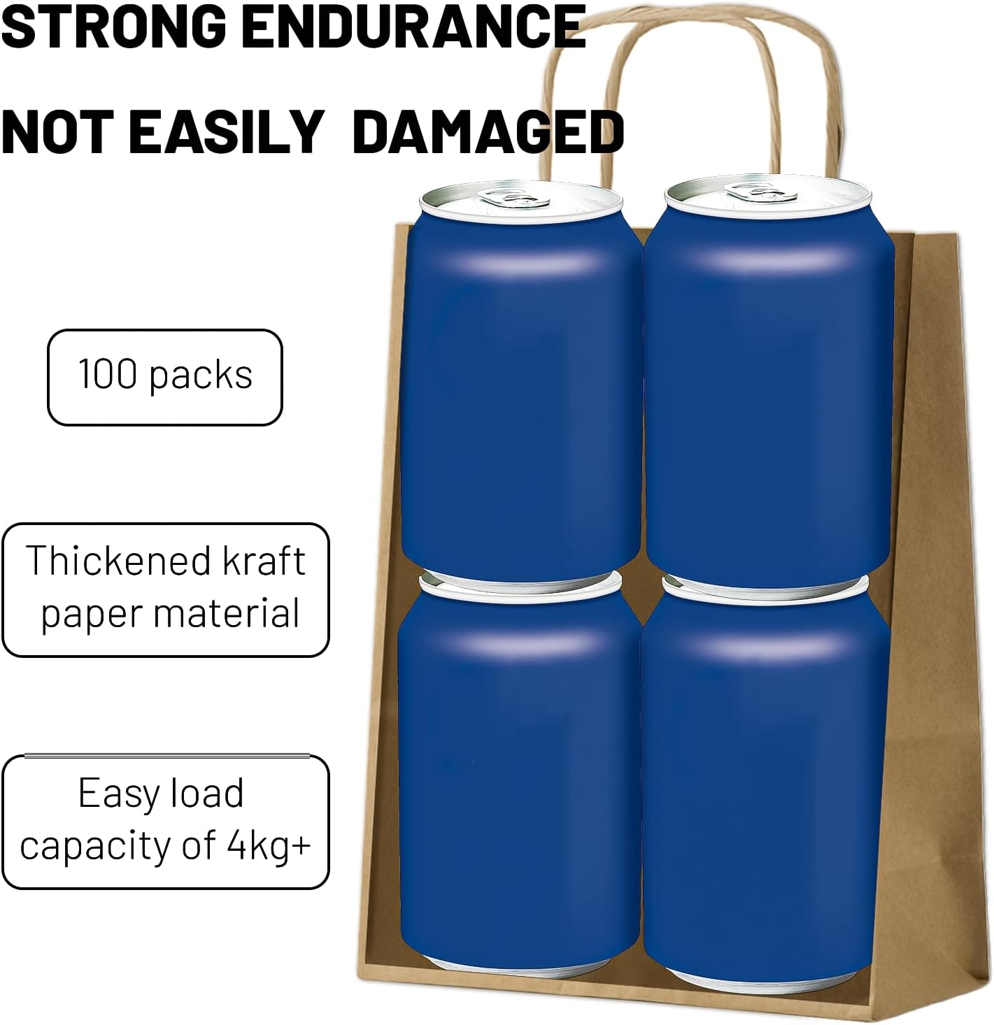 Elevate your packaging and gifting with our bulk pack of 100 high-quality brown kraft paper bags. Measuring 8.25"x5.9"x3.15", these durable and versatile bags are perfect for small businesses, retail, parties, weddings, and everyday use. Featuring sturdy handles and a classic, natural look, they provide a reliable and eco-conscious solution for all your bagging needs, from party favors to shopping and lunch carrying.