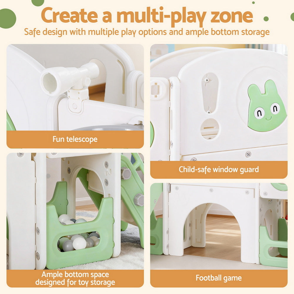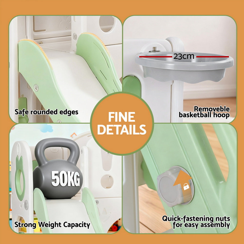 Keep your kids active and entertained with the Keezi 3-in-1 play set. It includes a wide platform, fun telescope, and safety ladder for endless fun. Built from premium HDPE in stylish grey and white, it features anti-slip steps, safe grip handles, and ample bottom space for toy storage. One ball and ring are included for added play. Easy to assemble and ideal for indoor or outdoor use. Note: Kids should be supervised by adults when using the swing.