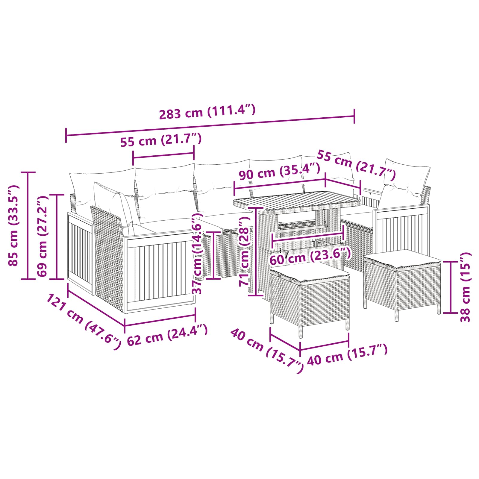 This Garden Sofa Set is a stunning addition to any outdoor area, mixing style with practicality. Imagine a modern and inviting setup on your patio, featuring clean lines and minimalist chic. Built for outdoor fun with friends and family, it brings comfort and style, really enhancing your garden decor with its woven texture and simple yet classy look. Robust Materials: The sofa set's made from high-quality poly rattan and powder-coated steel, built to handle any weather. These materials keep the set strong and stylish, blending durability with a touch of class. Functional Components: With storage built into the design, the set has arm sofas, centre seats, and stools, all with handy storage underneath. This smart feature helps keep your outdoor area tidy and maximises usability. User-Centric Features: The set comes with UV-resistant materials that fight fading and wear from sun exposure. Plus, the cushions come off for easy cleaning or replacement, keeping things fresh without much hassle. Versatile Usage: Perfect for gardens and terraces, this modern furniture adapts easily to spring and summer vibes. Its appealing look and functionality make it a go-to choice for anyone wanting to brighten up their outdoor space. Care Instructions: Keep this sofa looking sharp by wiping it down with a damp cloth and using a protective cover when it’s not in use. These simple steps help maintain its looks and make sure it lasts through the seasons.