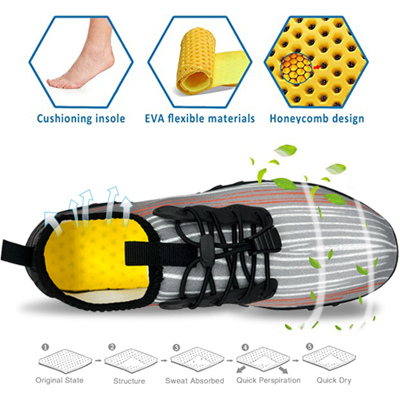 QUICK DRY DRAINAGE SYSTEM:Each bottom of these water shoes has several holes to ensure proper water outflow. It can quickly drain and cross-ventilate, preventing stuffy feet, foot slip, providing excellent flexibility and comfort. These holes are not big enough for sand or rocks to enter.