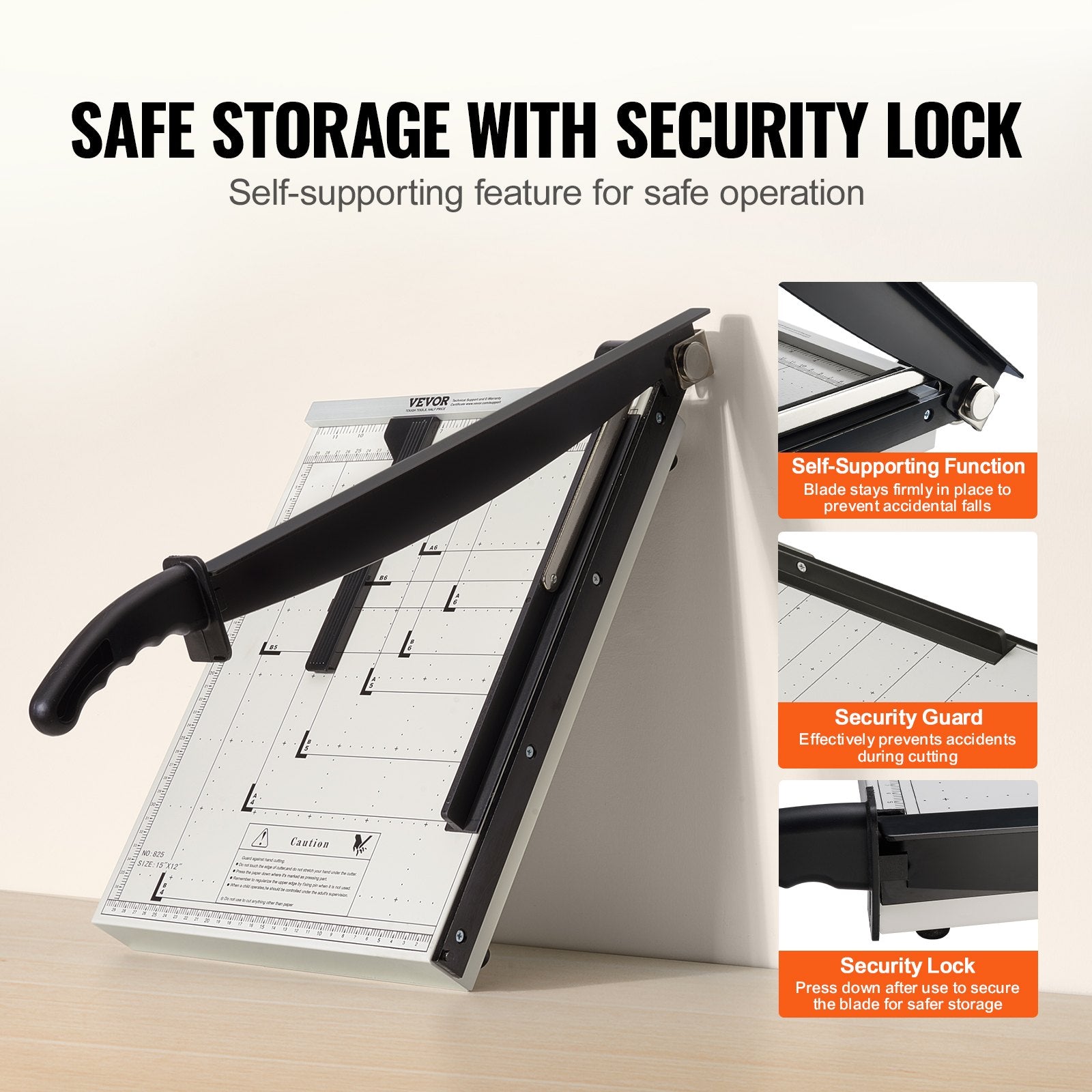 Your security matters to us. Our paper cutter guillotine features a self-supporting blade design for secure and stable cutting. Plus, it comes with a guard rail and blade lock for peace of mind during use and storage.