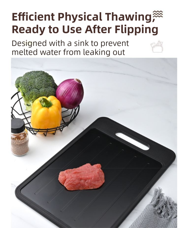 • Dual-Sided Design: Aluminum side for thawing; PP side provides a non-slip, food-grade cutting surface that is hard and resistant to high/low temperatures.