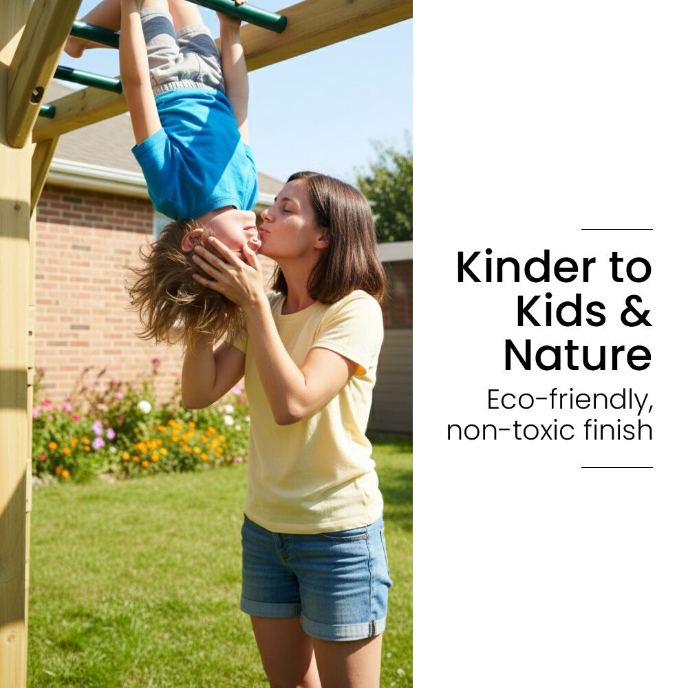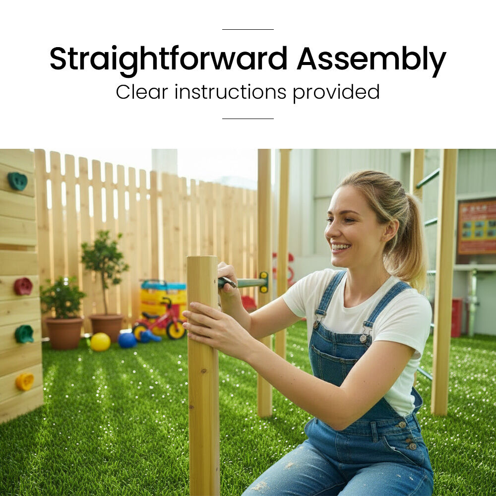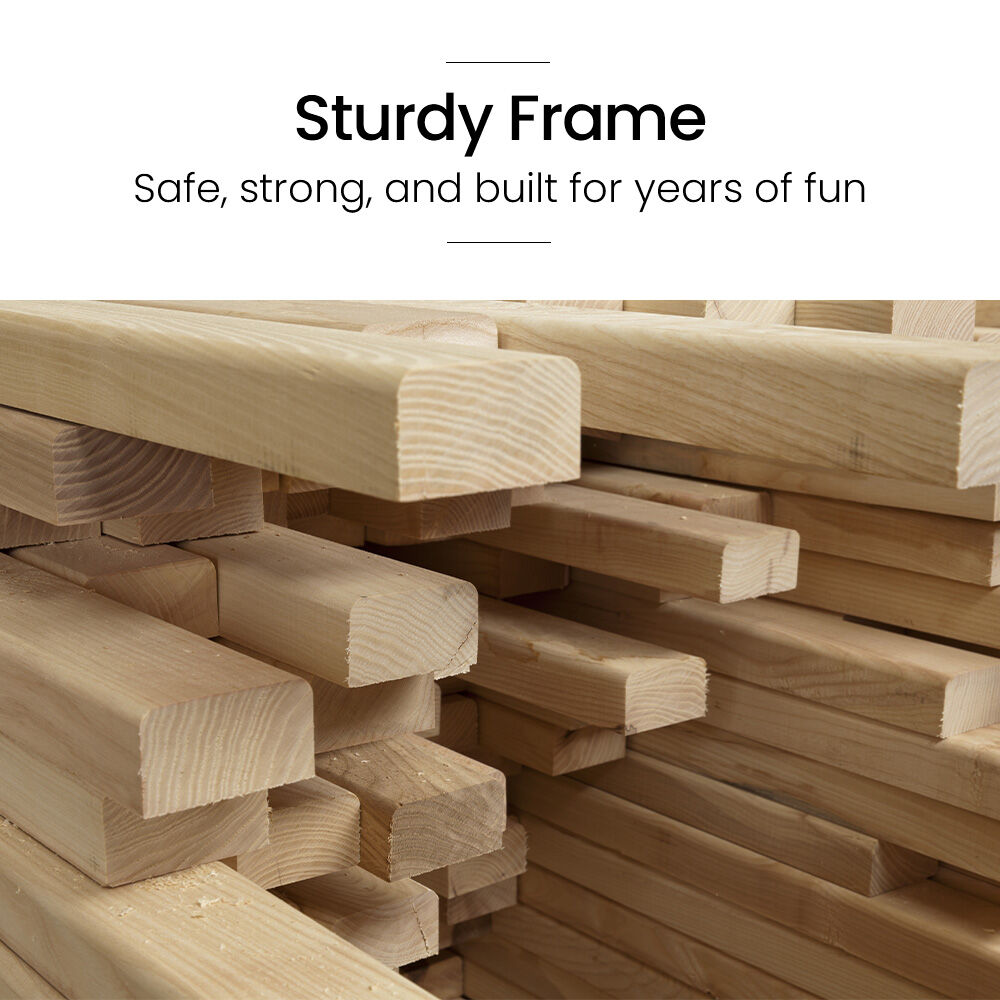 Built to last, the frame features premium UV-treated solid timber and powder-coated steel bars for strength and durability. Every edge is smooth and child-safe, so you can relax knowing they're playing safely.