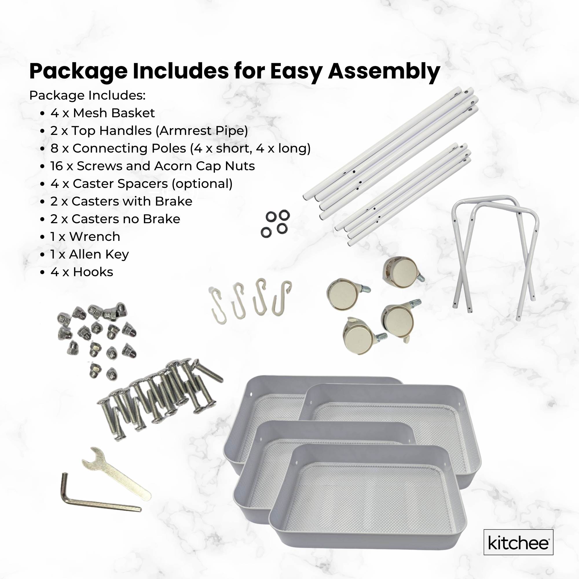 Kitchee 4-Tier Kitchen Storage Cart with Lockable Wheels will keep your home or office organised with this versatile rolling storage trolley. Featuring durable metal mesh moulded shelves, smooth-rolling caster wheels, and a lightweight steel frame, it’s ideal for use in the kitchen, bathroom, bedroom, office, or anywhere you need extra storage.