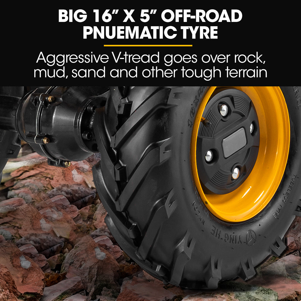 Go anywhere on the massive 16 x 5" inch aggressive deep V-tread front tyres that provide superior traction and drive. The large 10 rear tyres can handle rough terrain in gardens, on worksites and roll easily over your warehouse floor making it easy to move material over longer distances. The drive wheels have an electronic brake ensuring stability and control - making emptying and unloading easy!