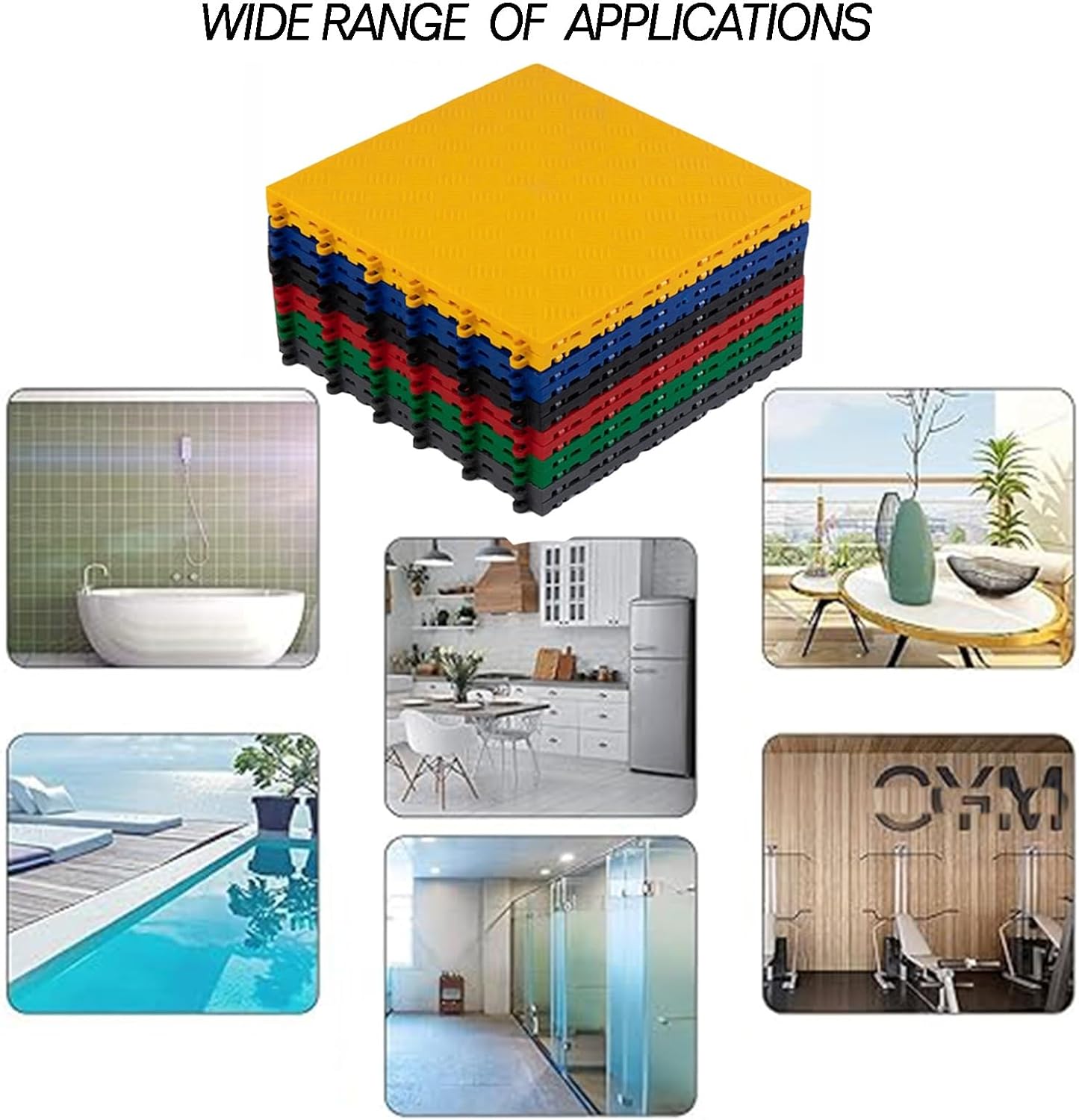 【Wide Application】Heavy Interlocking Drainage Floor Tiles Are Unaffected By Heat, Cold Or Sunlight and Are,Can Be Used A Variety Of Surfaces Such As Wood, Concrete, Tile, and Even Bathtubs. Suitable for Indoor Or Outdoor Use In Toilets, Bathrooms, car wash room, Swimming Pools, Gardens, Gymnasiums, Boats, Storerooms, Petting Zones, Garage, decks,Or Anywhere That Needs to Be Drained And Dried.