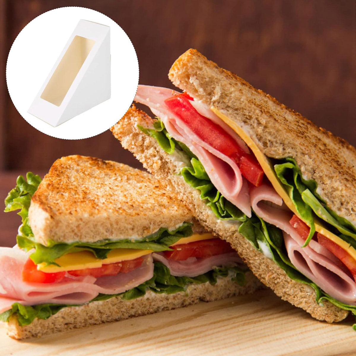Crafted from food-grade paper and plastic, these sandwich boxes offer a practical solution for packaging sandwiches, cakes, or small desserts. Featuring a triangular design with a transparent window, they provide a clear view of the contents for convenience and display. Ideal for cafes, bakeries, takeaways, or home use, they combine function and aesthetics to enhance food presentation.