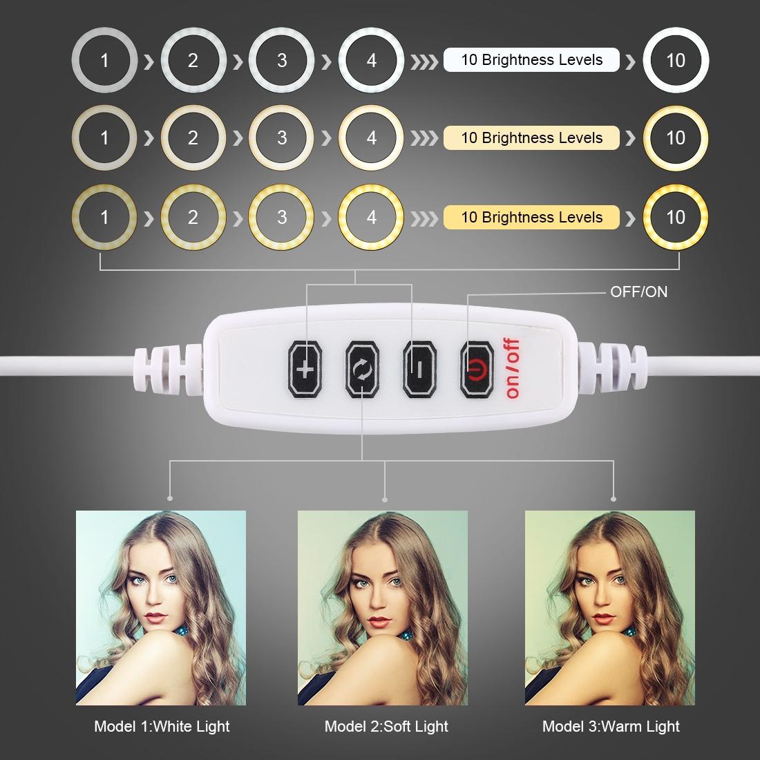 • Three lighting modes with adjustable brightness for natural and enhanced skin tone