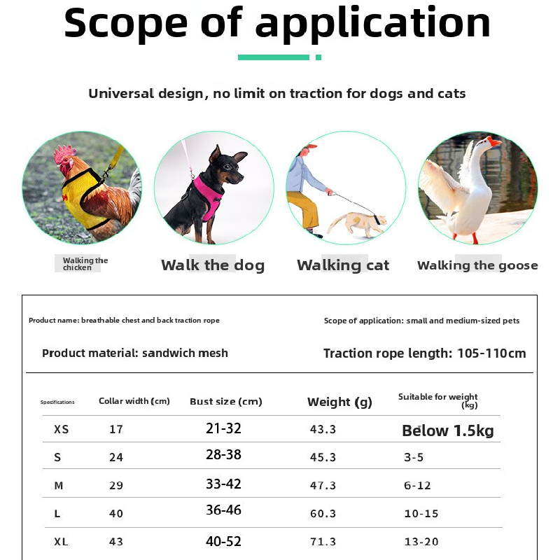 This versatile pet harness and leash set is designed for safe, comfortable walks with small pets including dogs, cats, chickens, ducks, and other medium-sized animals. Featuring a breathable mesh construction, adjustable straps, and an anti-escape design, it ensures your pet stays secure while enjoying outdoor time. Ideal for daily walks, training sessions, or farmyard adventures across Australian homes.