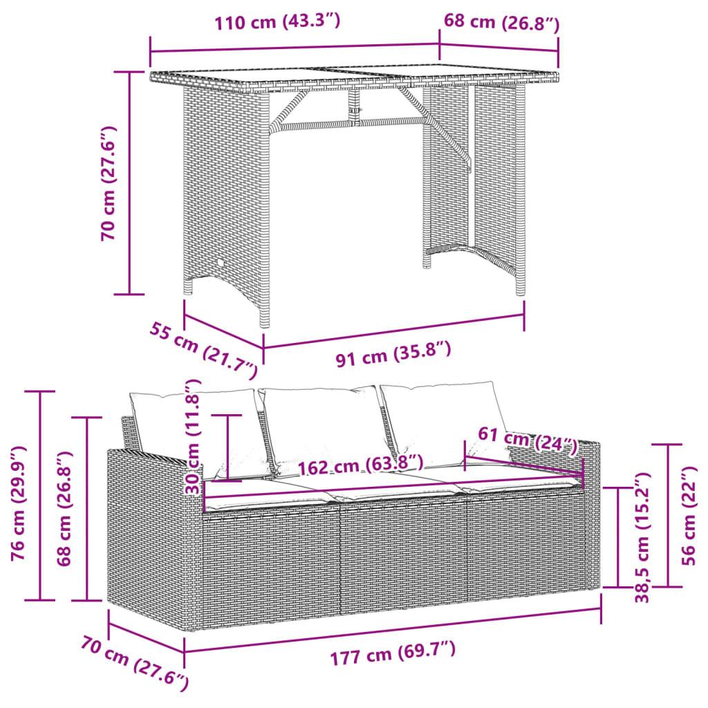 This garden dining set is a great choice for al fresco dining or just relaxing in the garden, backyard, or on the patio. Durable material: PE rattan, also known as poly rattan, is a strong, low-maintenance synthetic material that looks like natural rattan. It's lightweight, easy to clean, and commonly used for outdoor furniture due to its durability and weather-resistant properties.Glass tabletop: The outdoor table's top is made from strong and durable tempered glass, making it easy to clean with a damp cloth and adding a touch of elegance to your outdoor space.Comfortable seat experience: This outdoor furniture, complete with thickly padded cushions, offers a comfortable seating experience.Removable and washable cover: These seat cushions feature removable covers for easy washing and maintenance.Robust and stable frame: The powder-coated steel frame ensures that the garden furniture is strong and stable for daily outdoor use. Good to know:To make sure your outdoor furniture stays beautiful, we recommend protecting it with a waterproof cover.