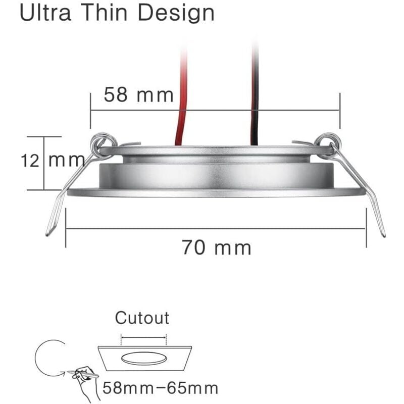 General Description This pack of 4 3 watt, 12 volt LED lights offers a high quality, durable and stylish finish, with a lifespan of 50,000 hours. Ideal for use in motorhomes, caravans, boats, yachts, kitchens, bathrooms and bedrooms. Technical Specifications Power: 3W Voltage: 12V DC Lumens: 215 Color Temperature: 3200K (warm white) Beam Angle: 120° Dimmable with PWM dimmer Dimensions: Diameter 70 mm, thickness 12 mm Mounting hole: min. 58 mm, max. 65 mm Compatibility and Accessories Suitable for use with a 12V DC power supply. Do not use with 110V-230V AC power supply. Installation Easy to install thanks to its compact dimensions, the lightweight body fits into tight spaces. Ensure the mounting hole is between 58 mm and 65 mm. Use Perfect for interior lighting in various applications such as RVs, boats, and home spaces, providing warm and comfortable light.