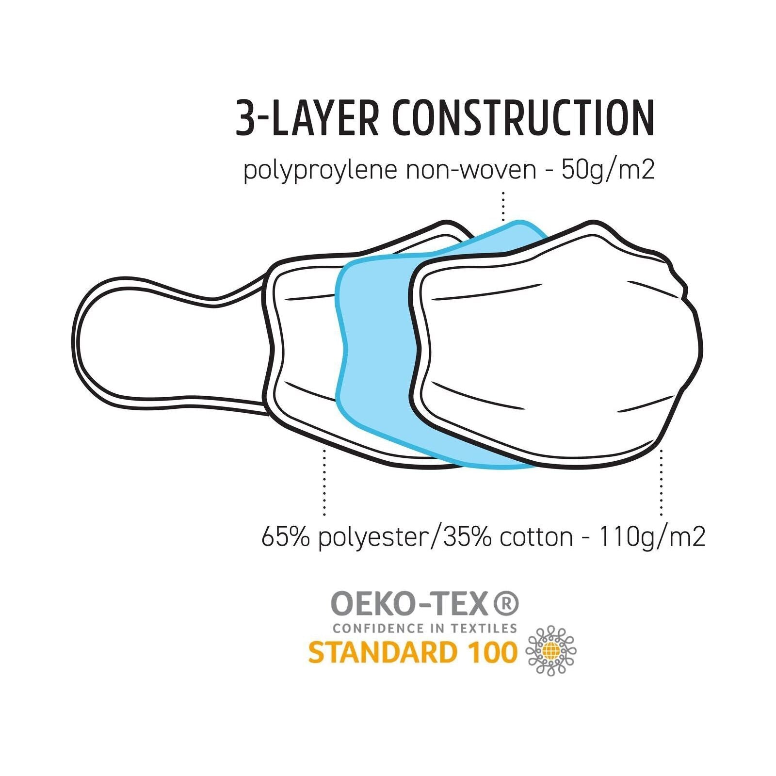 Made from 2 layers of Polycotton fabric (65% polyester, 35% cotton) and a Polypropylene core (3 layer total)