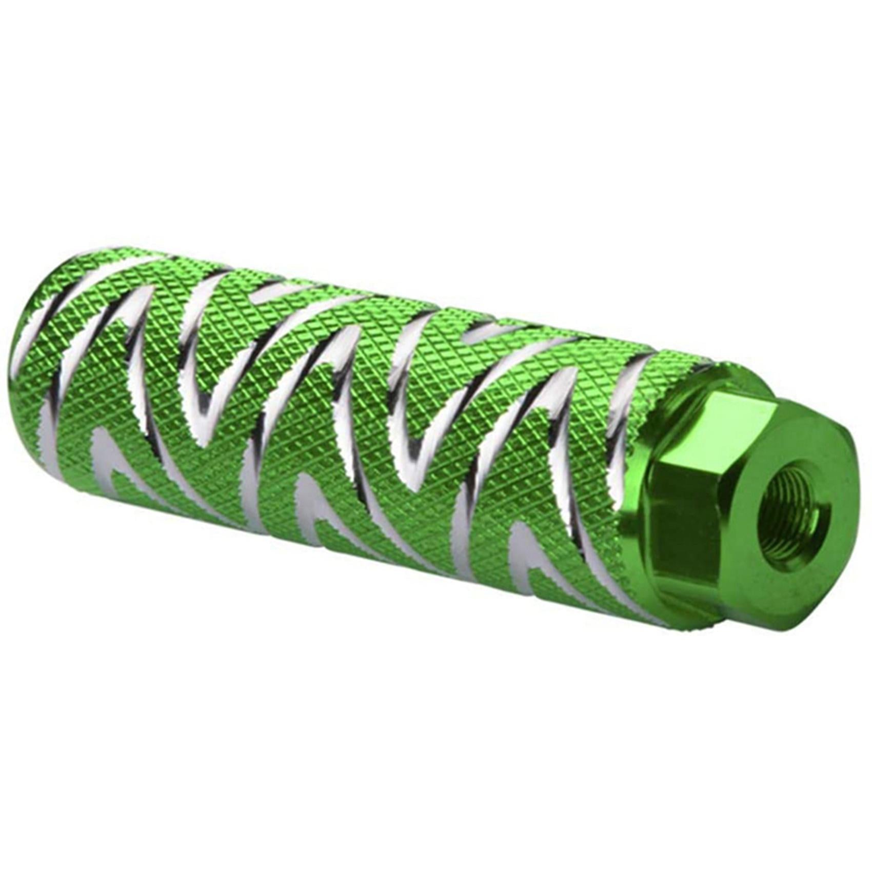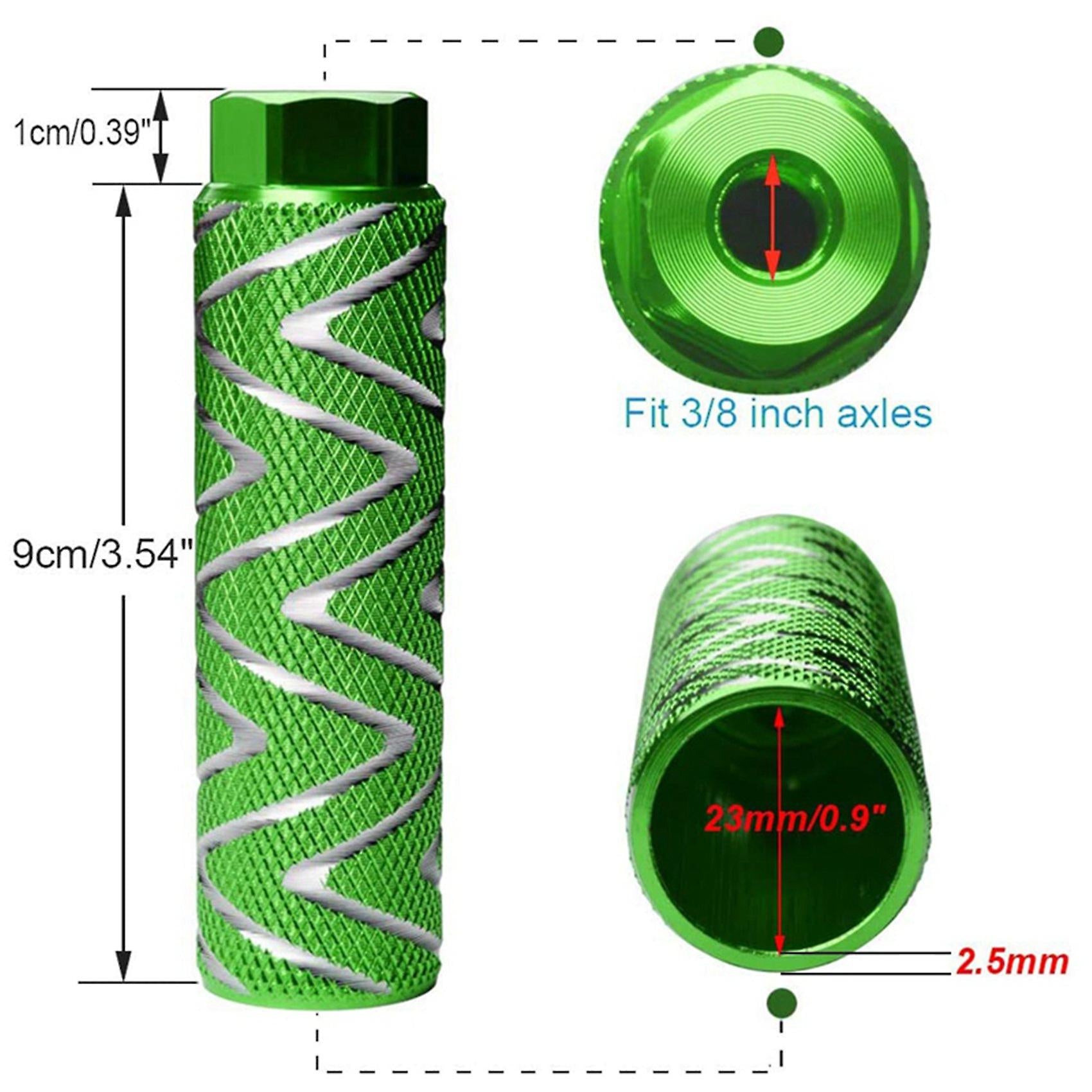 • LARGE SIZE, Suitable for universal bicycle or BMX. 3/8 axle x 26T, Fits 3/8 inch axles. ALL STEEL pins, heavy duty. Knurled pins, non-slip. Suitable for both front and rear axles. Product Name: Bicycle Pedal Applicable Models: BMX show BMX / Mountain bike / Ordinary bicycle Process: Cold extrusion, one molding Shape: Cylindrical, non-slip twill on the surface Load capacity: less than or equal to 100 kg (200 lb) NOTE: Quick release hub bicycle cannot be installed Avoid standing on your feet while cycling, reduce the risk Color: green Material: aluminum alloy Size: 100x25.5mm Package Contents: 4 x Bicycle Pedal The above package content only, other products are not included. Note: Light and different displays may cause the color of the item in the picture a little different from the real thing. The measurement allowed error is +/- 1-3 cm.