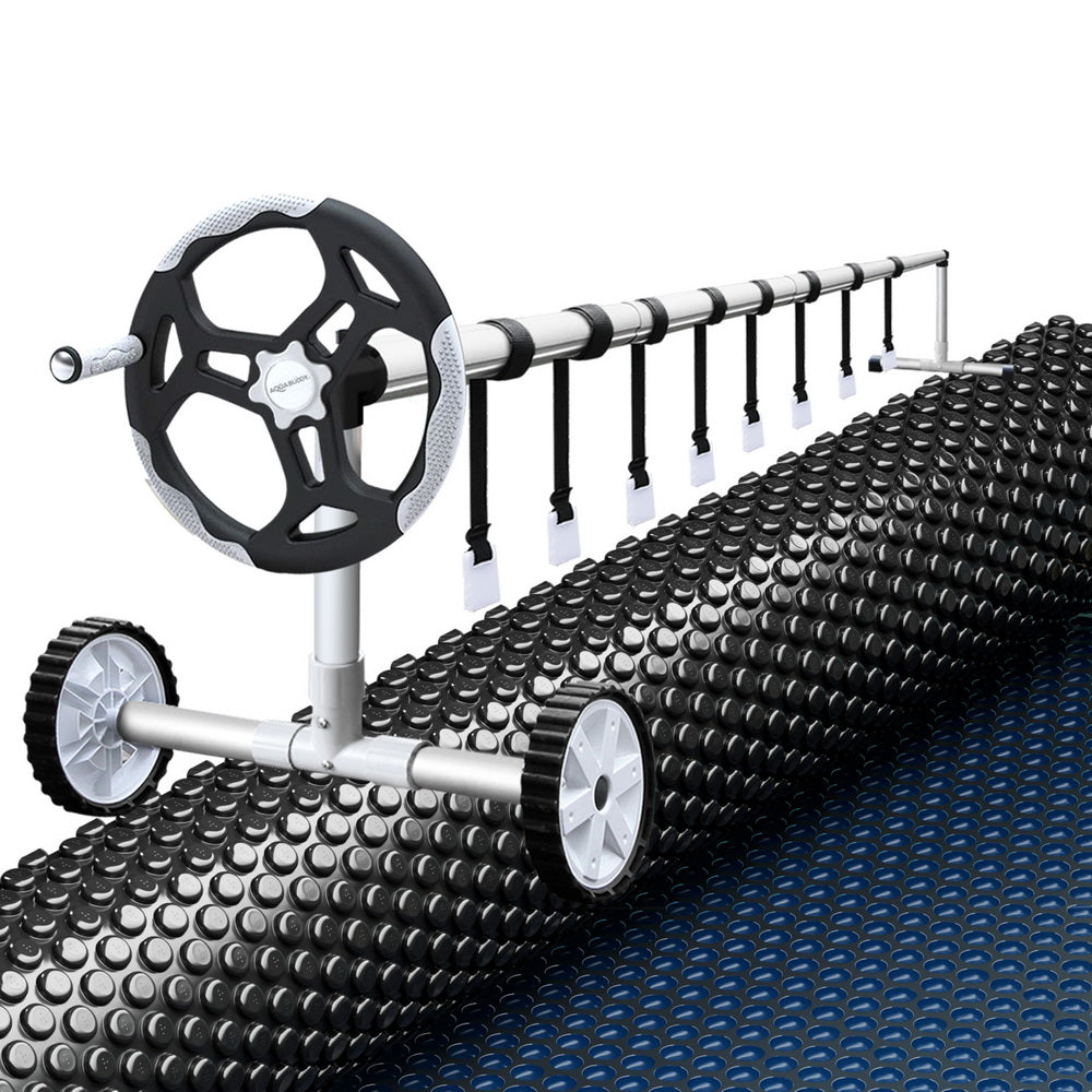 Keep your pool clean from debris and warm from the power of the sun with Aquabuddy's Aluminium Pool Roller and 9.5m x 5m Pool Cover. Made of sturdy aluminium construction with full adjustability, this pool roller is suitable for pools with a width between 2.4m-5.55m. It is equipped with premium anodized aluminium alloy telescopic poles, plastic wheels for maximum portability, and a low friction crank wheel to easily roll up your pool cover and get right in the water. The solar pool cover is made from premium low-density 600-micron polyethylene, which makes it extremely durable. The blue top and black underside allow the sun's rays to penetrate the pool, increasing the temperature and significantly reducing water evaporation. Finally, the cover keeps the pool water clean all year round, reducing the time spent maintaining the water, pumps and filters. Get the best of natural resources and save money on chemicals and water; get yourself an Aquabuddy Pool Roller and Cover set today!