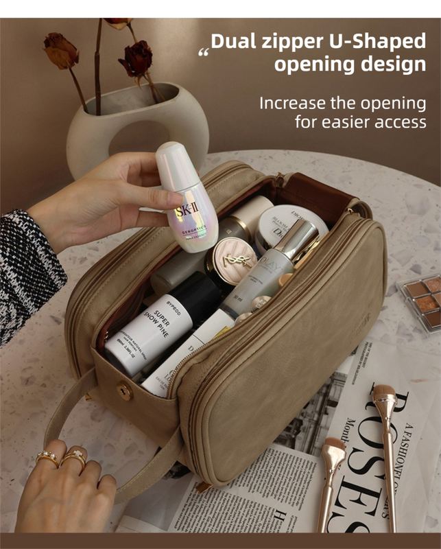 Keep your skincare, makeup, and toiletries perfectly organized with our Large Capacity Premium Makeup Bag. Crafted from high-grade TPU leather, this bag combines a luxurious, supple feel with rugged durability and water resistance. The innovative double-zipper design creates two main compartments, allowing for efficient dry and wet separation—perfect for storing damp face towels away from your dry eyeshadow palettes. Whether you're heading on a long-haul flight or a weekend getaway, this lightweight and expandable organizer ensures all your beauty tools stay protected, upright, and easy to find.