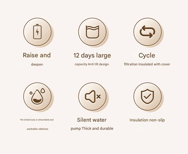 • Intermittent Dispensing Mode: Option to dispense water automatically every 30 minutes (Intermittent Mode), ideal for quieter environments or less active pets.