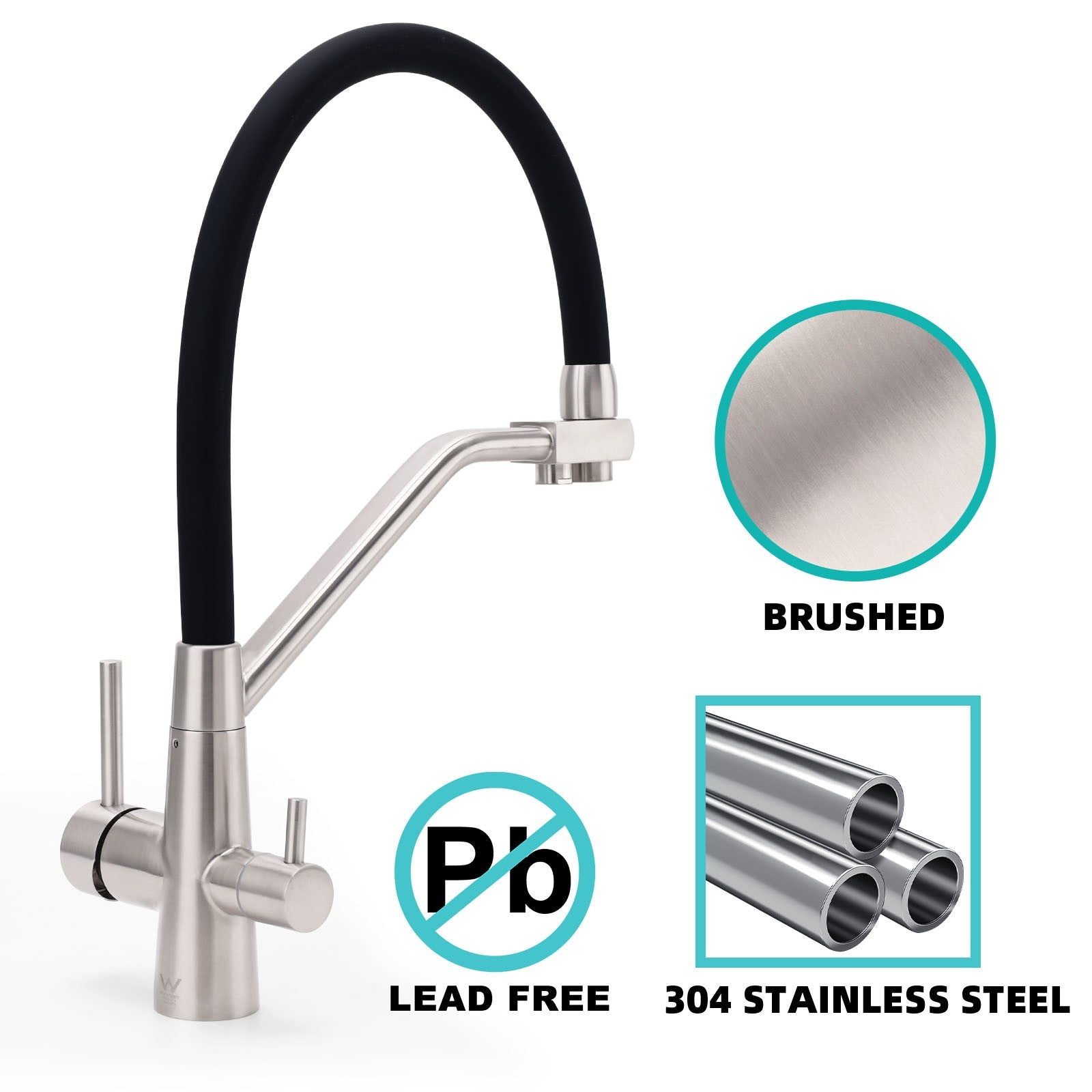 Brushed Nickel 3 Way Kitchen Mixer Pure Drinking Water Sink Tap Pull Down Spout Watermark and WELS Approved License number: 1632 Reg. number: T43626 Star rating: 6 Water consumption: 4.5 Material & Finish Material: 304 stainless steel body+silicone black hose Finished: Brushed nickel body 2 spout outlet: one for mixer water and the other for pure water 2 handles: one controls hot and cold water and the other controls pure water Ceramic cartridge, watermark approved. Durable for use. Package Includes: kitchen tap+fixed screws+inlet hoses We offer: 3 years warranty on the quality of body and cartridge 1 year warranty on finishing