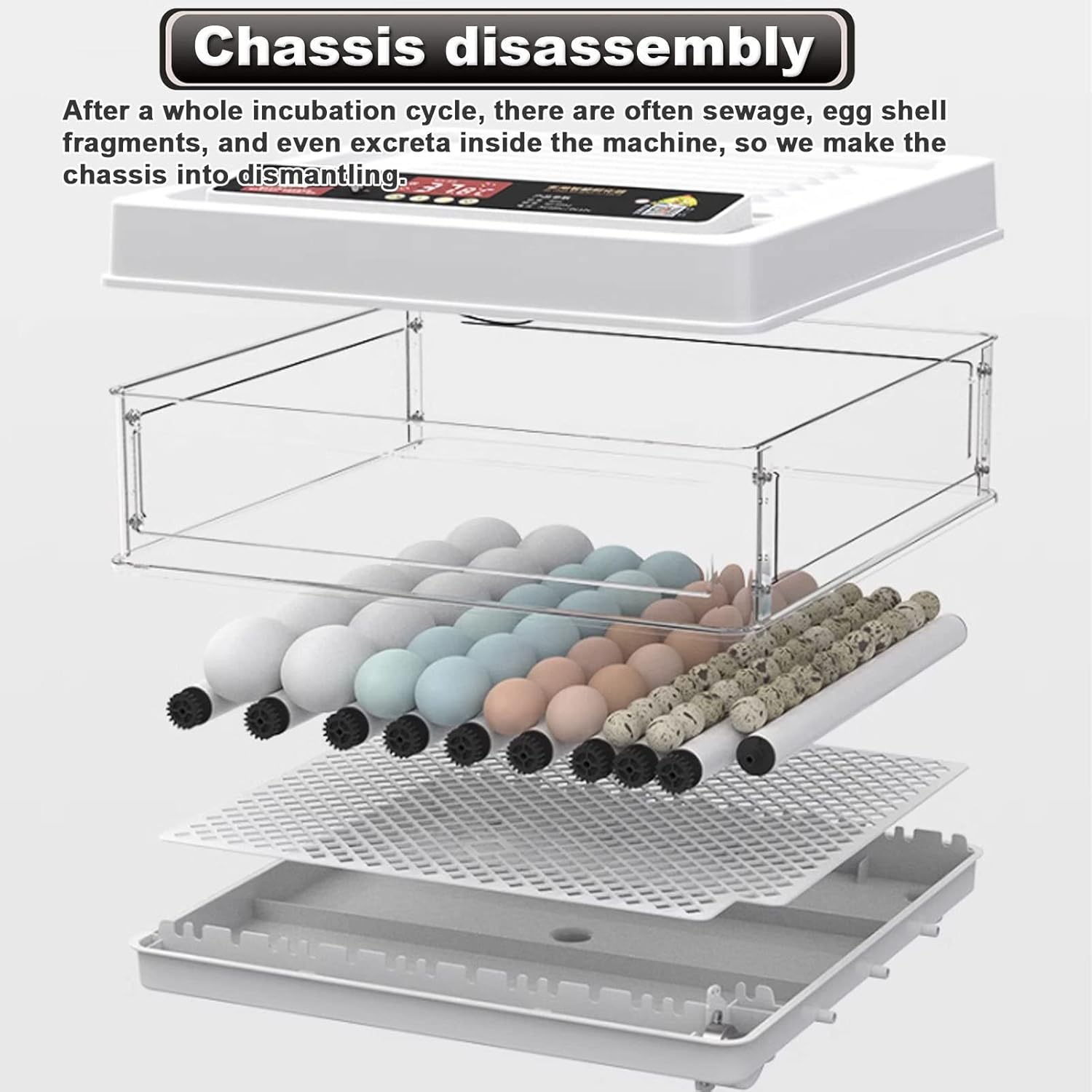 CARLA HOME 70 Egg Incubator with Automatic Turning, LED Display, Humidity & Temperature Control, Auto Water System & Built-in Egg Candler for Chicken, Duck, Quail, Goose This item stands out for the following characteristics: ADVANCED AUTOMATIC HUMIDITY CONTROL: This CARLA HOME incubator features a dual‑port auto water system with external refill bottles, allowing precise humidity management without opening the lid. Adjustable air vents, dual‑zone humidity levels, and built‑in alerts help maintain ideal conditions throughout all hatching stages. CONSISTENT AUTOMATIC EGG TURNING: Designed to turn eggs automatically every 1–3 hours, ensuring even warmth and reducing manual effort. The incubator automatically stops turning during the final days of hatching to protect developing chicks and support higher hatch rates. DIGITAL LED TEMPERATURE & HUMIDITY DISPLAY: A clear LED screen shows real‑time temperature and humidity, with simple button controls for accurate adjustments. The airflow‑balanced heating system keeps the environment stable, preventing hot or cold spots that could interrupt development. BUILT‑IN EGG CANDLER FOR EASY MONITORING: Includes an integrated LED egg candler on the top panel, letting you check fertility and observe embryo growth without removing eggs. The 360° transparent dome allows full visibility of the hatching process—ideal for education, farms, and home learning. Key features: Item Dimensions: 46 x 14 x 46 cm. Item weight: 3.2 kg. Package Dimensions: 49 x 49 x 16 cm. Package weight: 3.74 kg. The box includes the product and all its components and a simple instruction set. One product per package.
