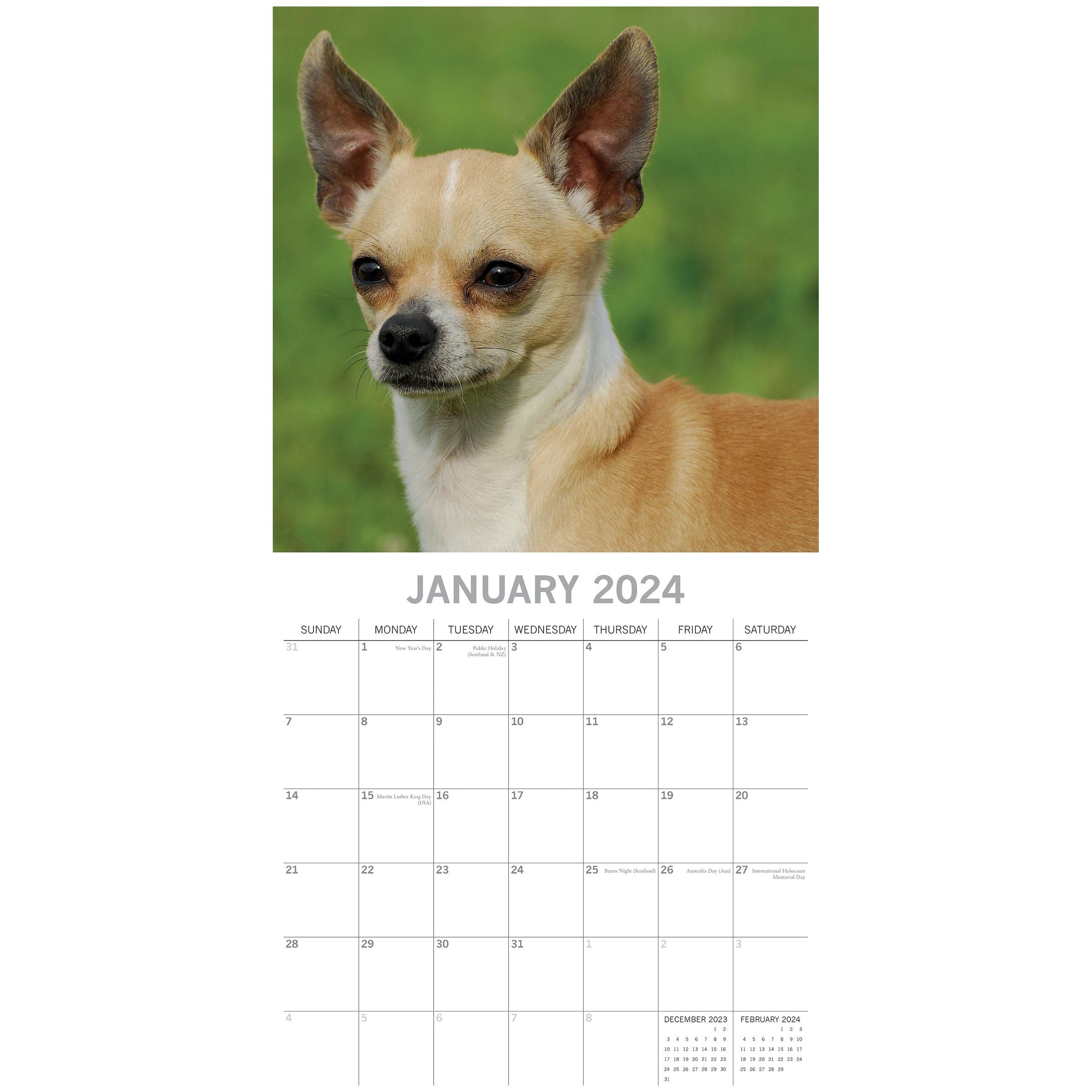 Chihuahuas are small, sprightly, loyal, and lively. They get their name from the desert state of northern Mexico. Legend says that they were sacred to the pre-Columbian people. Considering they average under five pounds, it is no wonder that they have a special attachment to the warm sun of Mexico. Chihuahuas are most comfortable in their owners’ arms, but they look rather cheerful alone and amongst themselves in this square wall calendar. Brand New Calendar with Beautifully design, Sealed in Original Packaging, each calendar includes a large grid running from Sunday to Saturday. Publisher: The Gifted Stationery Co. Dimensions: 30cm (w) x 30cm (h) closed; 30cm (w) x 60cm (h) opened Time Span: 16 months (January to December 2024 monthly, September to December 2023 on-a-page) 2024 Square Wall Calendar featuring beautiful colour photographed images for every month of the year. Like most Wall calendars, this one comes with: