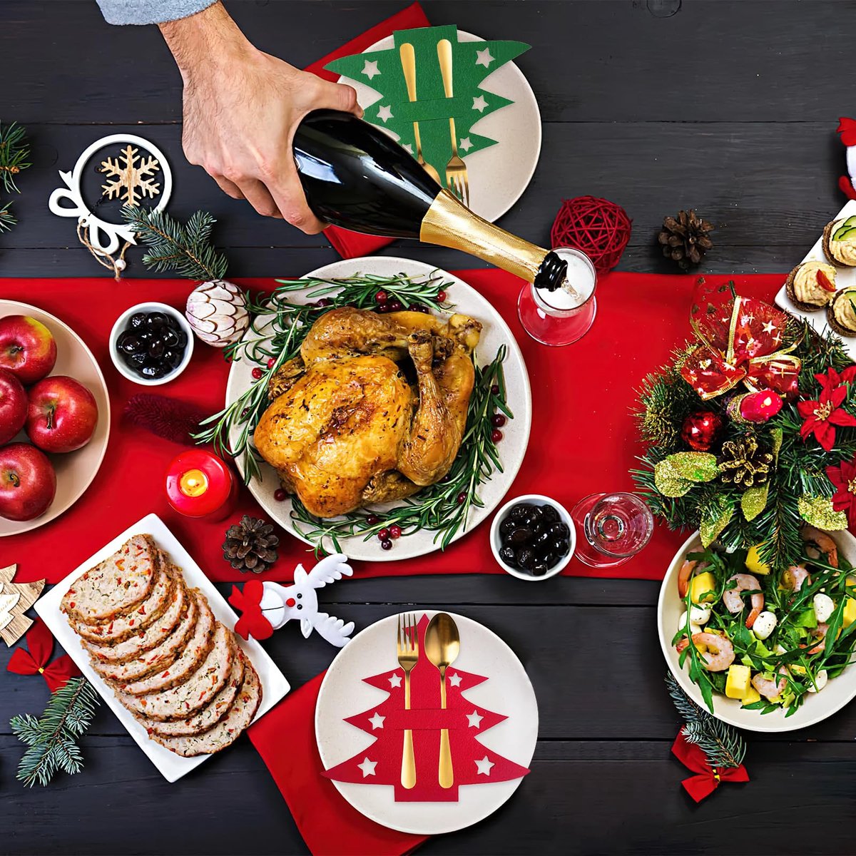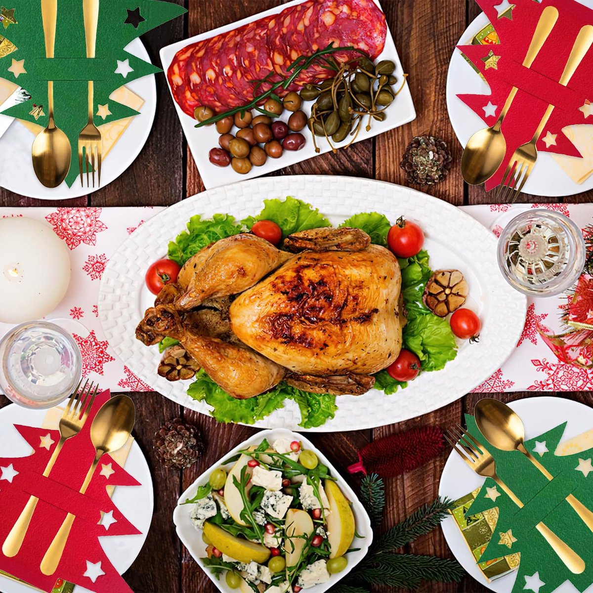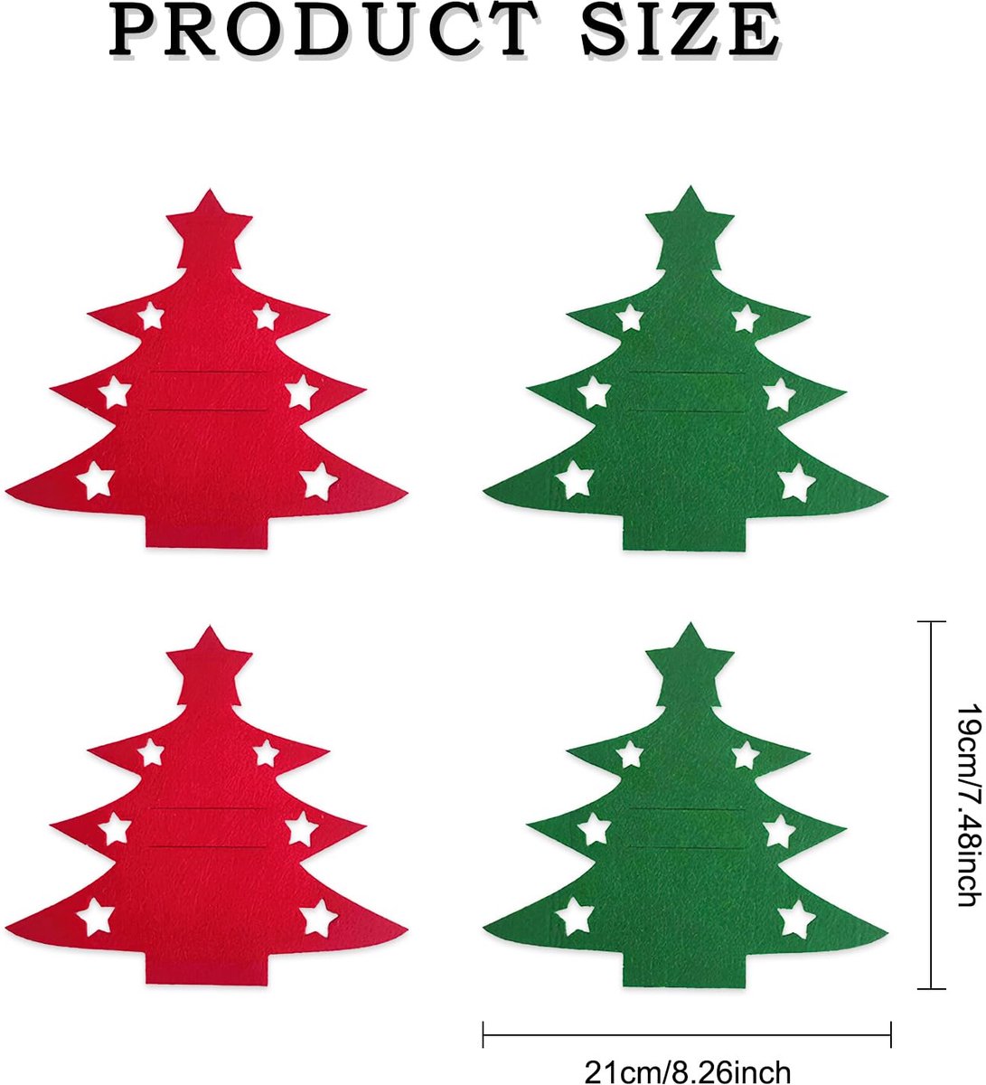 Product Description: You will receive 24 pieces Christmas tree cutlery holders Design: The cutlery holders are shaped like a Christmas tree, exuding Christmas atmosphere Material: These Christmas cutlery holders are made of felt, which is convenient, durable and reusable Christmas Decoration: The cutlery holder is a great choice for Christmas table decoration and can brighten up your dinner; impress your family and guests Wide Application: In addition to cutlery holders, it can also be used as a mini Christmas tree decoration, or to decorate Christmas trees, dining tables, stairs, walls and fireplaces, thus creating a cheerful Christmas atmosphere