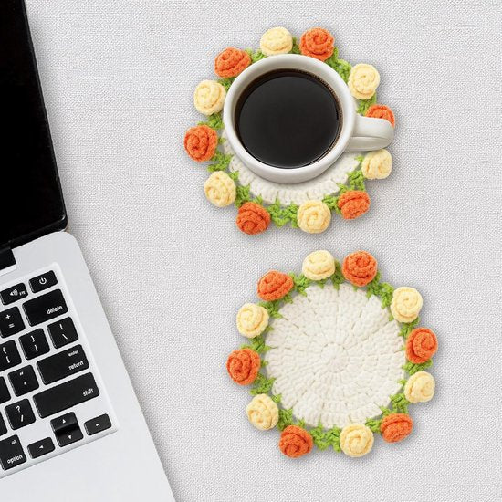 The coaster features an elegant floral motif and has a soft, decorative look. The design adds a warm and inviting touch to coffee tables, dining tables, or desks.