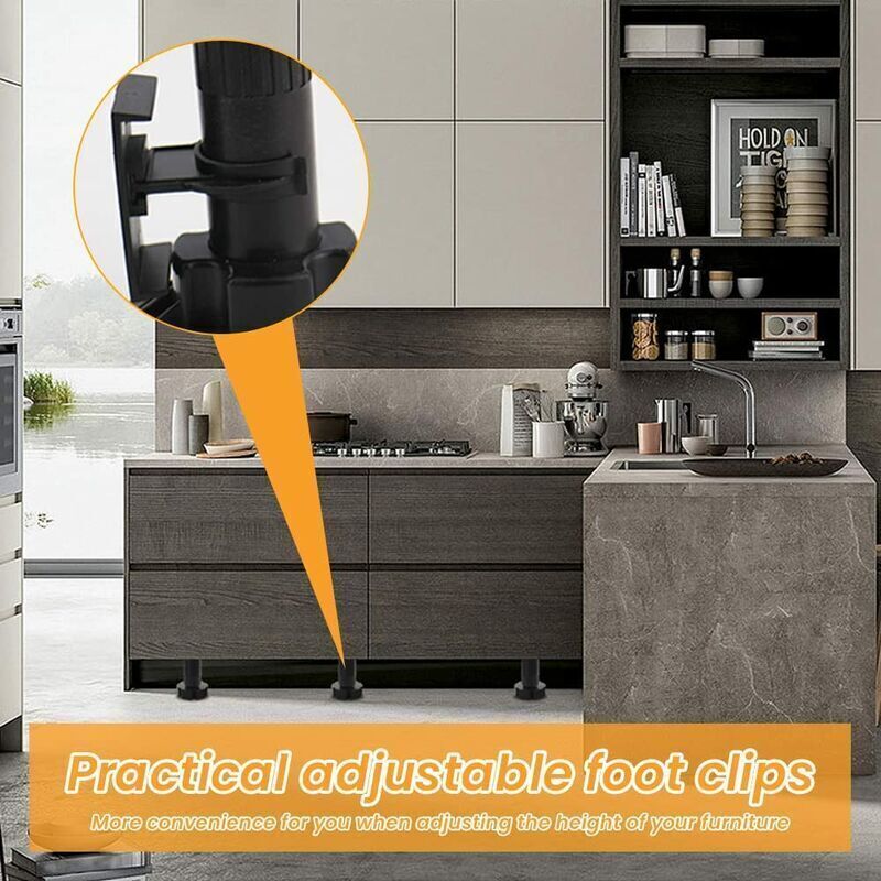 • 20 Kitchen Plinth Clamps: This set includes 20 kitchen plinth clamps, enough for daily use. There are a total of 40 screws, 2 screws for each adjustable leg clamp. This clamp can be used to fix most furniture with adjustable legs. * Fits 28mm-32mm Furniture Feet: This plinth clamp is designed with a semicircular opening to easily fit your furniture feet. This adjustable leg clamp is suitable for cylindrical furniture feet from 28mm to 32mm. Please measure your furniture feet before purchasing. * Durable Plastic Material: Made of high-quality plastic, the adjustable leg clamps are durable, break-resistant, waterproof and moisture-proof, and ideal for use in the kitchen. The plastic material is rust and corrosion resistant and more durable than metal adjustable leg clamps. * Easy to install and firmly fixed: Screwable plinth clamp is very easy to install, first fix the base plate to the wall with 2 screws, then place the clamps on the base plate and finally embed the furniture feet into the semicircular clamps. Provides a firm and secure fixation for your furniture. * Practical Kitchen Furniture Plinth Clamp: The kitchen furniture foot clamps give you extra comfort when adjusting the height of your furniture and you can use it for most round furniture feet. Keep your furniture feet firmly in place and no longer worry about your furniture slipping when adjusting the height. Package includes: 20 * Kick Plate Clamp 40 * Screws Adjustable feet are not included in the package.