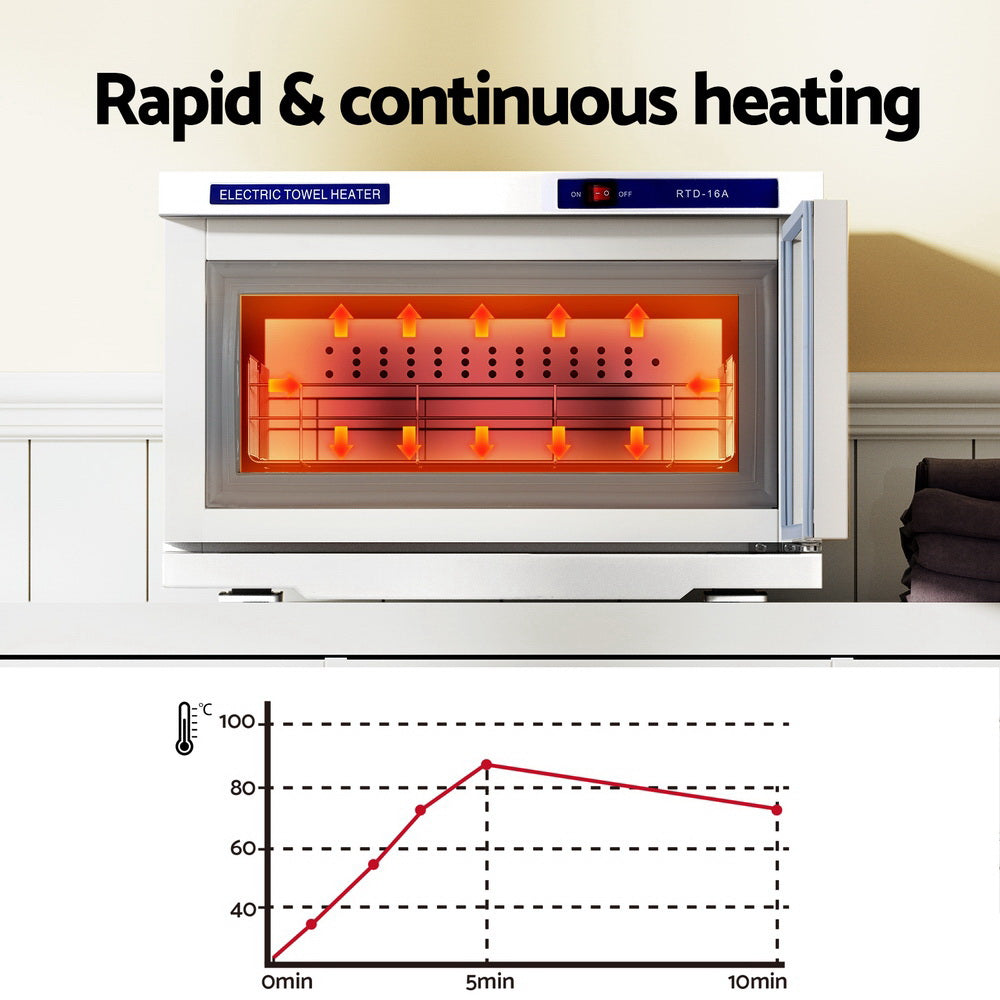 The 16L capacity towel warmer is perfect for drying towels, clothes, and blankets. A constant temperature of 72-74°C is maintained, making it a great addition to your spa, salon, home, and hotel. With a quick heat-up time of 5 minutes, you'll always have hot towels. The double-walled insulated design ensures greater efficiency, while also being mildew-resistant. The removable basket and one-button control make it simple to use. The Australian standard plug ensures safe usage, so you can rest assured your towels are in safe hands. Get this high-quality towel warmer and experience the luxury of warm towels every time!