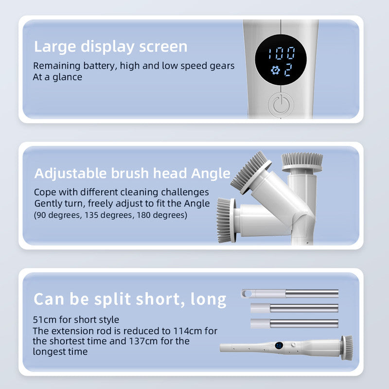 Dual Spin Speed: Features 2 adjustable speeds (400 RPM and 440 RPM) and a digital display for easy monitoring. Whether you need a gentle clean for delicate surfaces or a more powerful scrub for stubborn grime, this brush adapts to your needs.