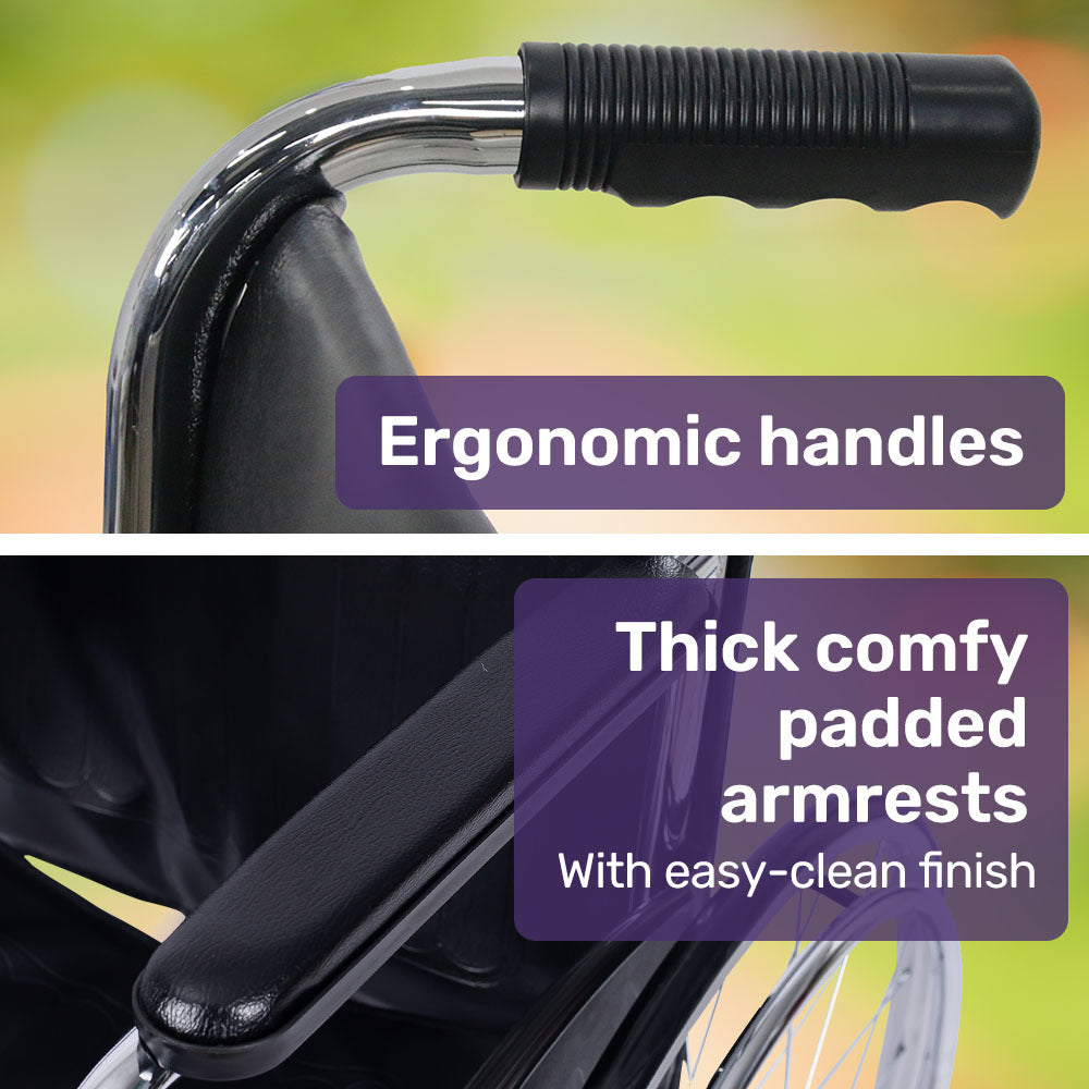This Equipmed wheelchair features height adjustable footrests that also swing up for easy access onto the wheel chair. Comfy padded armrests and a comfortable seat with a generously proportioned backrest ensure a comfortable ride. And, thanks to the 2 second folding action and ergonomic handles, it makes for a relaxing day out for any helpers, too!