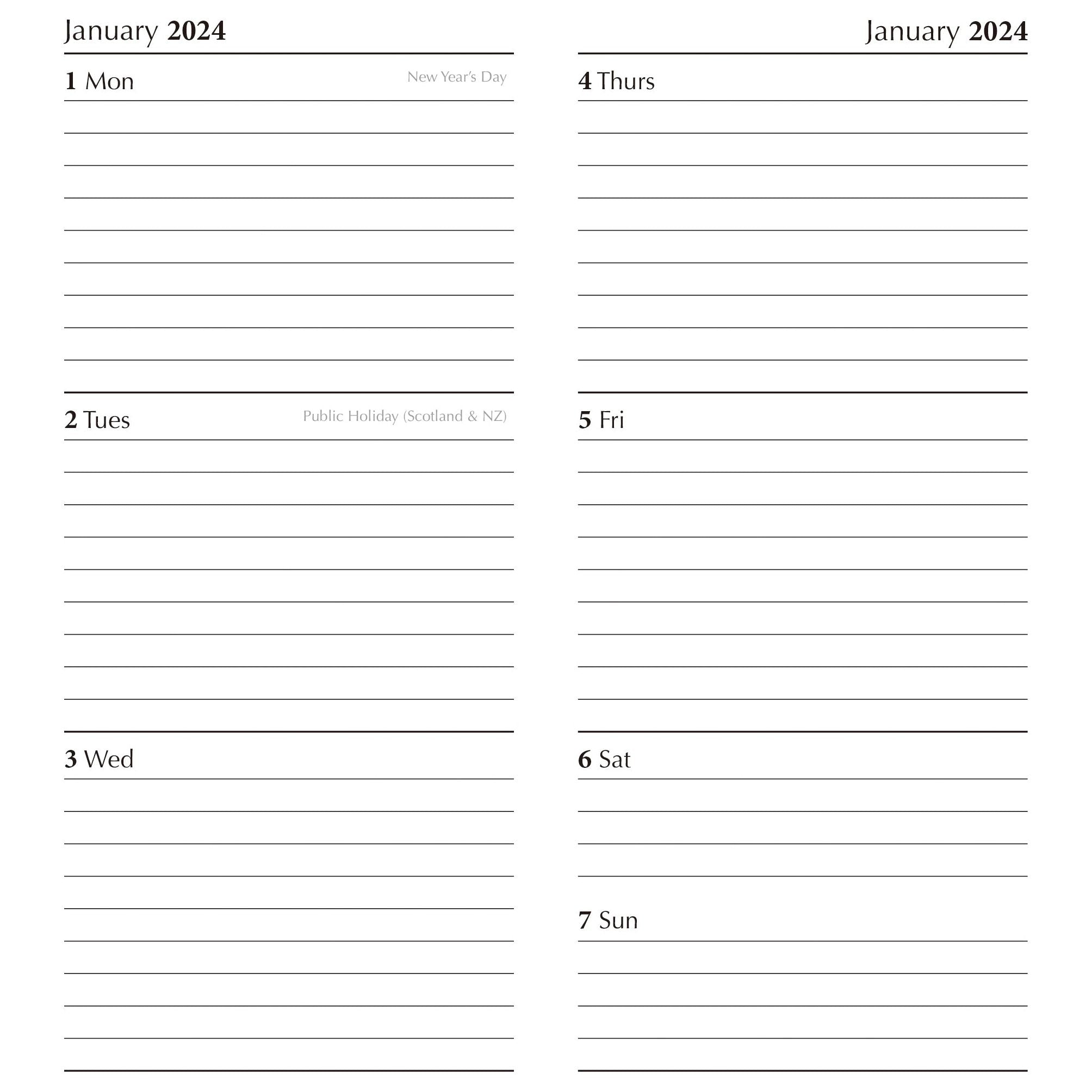 • Format: Week To View (from Monday through to Sunday in two pages)