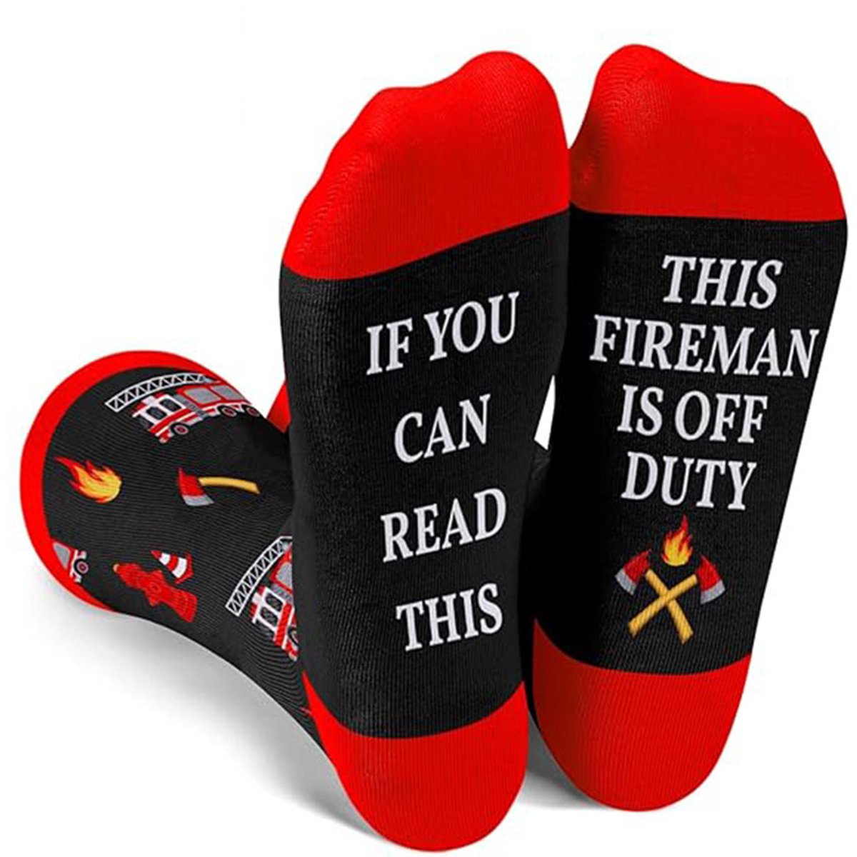 Funny socks with the text "If you can read this, this fireman is off duty." A nice tribute or gift for (former) firefighters, or for fans of the emergency services. Soft, warm, and full of humor.