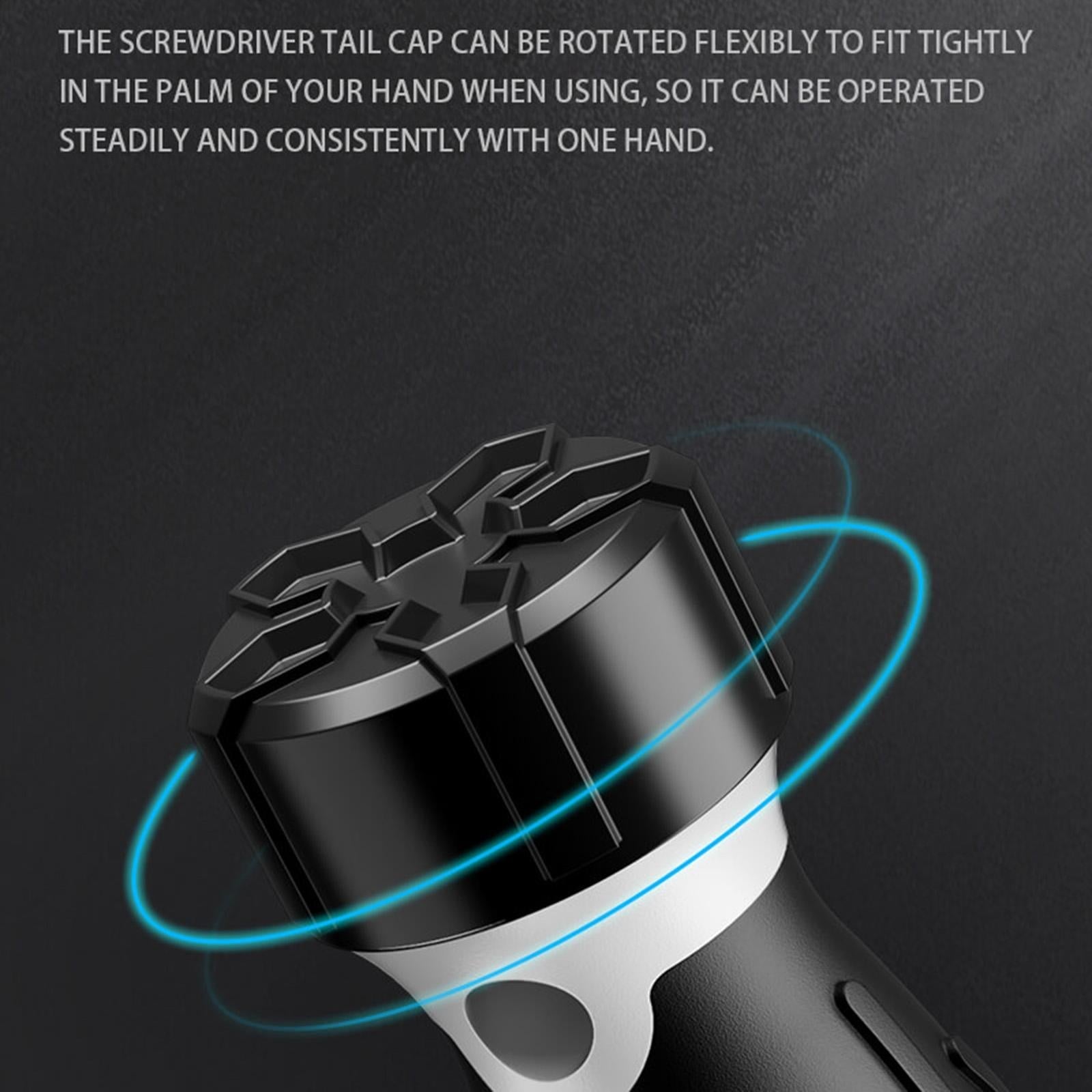 � 360-free rotating cap, flexible and convenient: The screwdriver tail cap can be rotated flexibly to fit tightly in the palm of your hand when using, so it can be operated steadily and consistently with one hand.