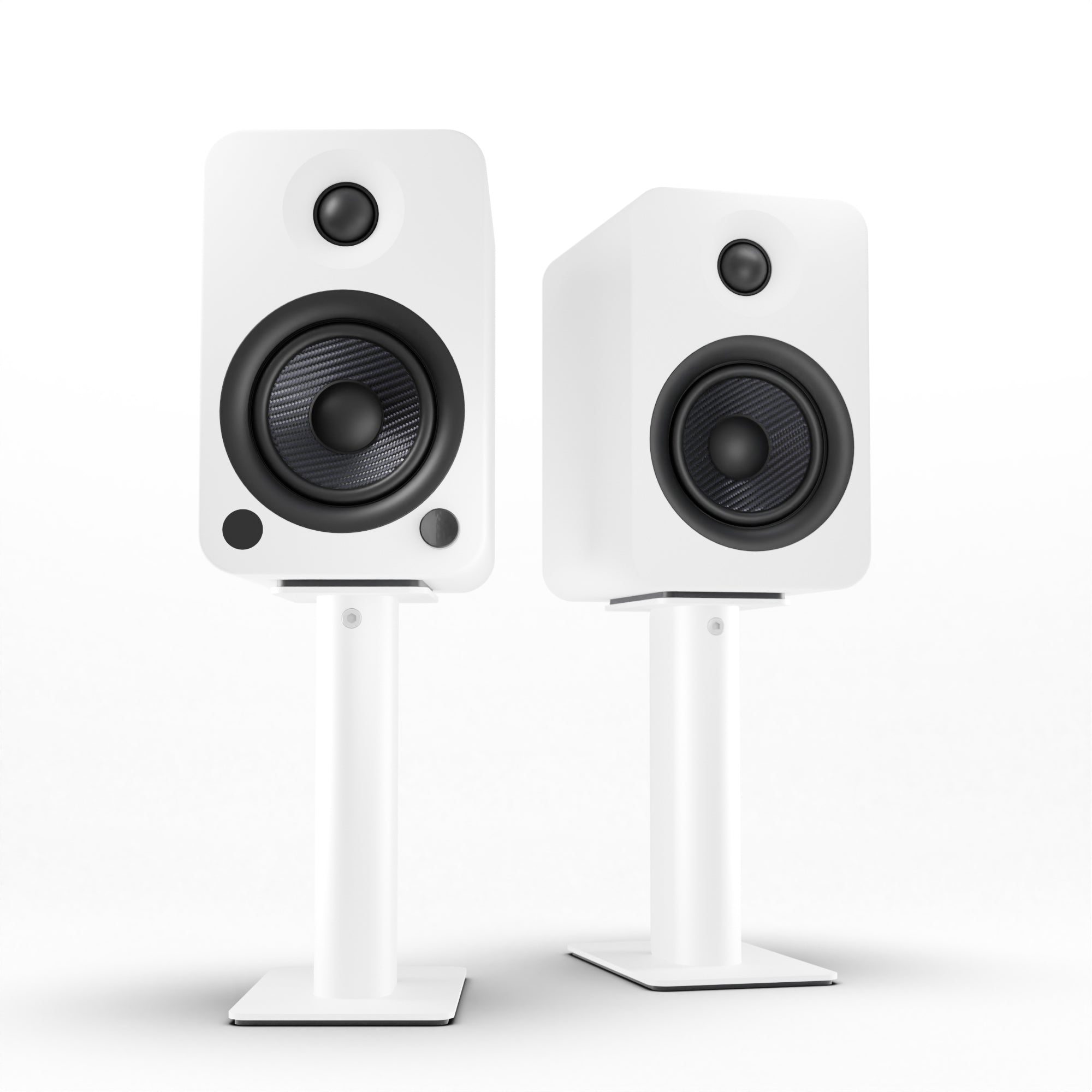 Experience exceptional sound quality with the Kanto YU4 140W Powered Bookshelf Speakers in Matte White. Designed for shared enjoyment, these speakers produce rich, spacious sound with their 140W peak power Class D amplifier. Featuring 4” Kevlar® drivers and 1” silk dome tweeters, they faithfully reproduce your favorite tunes with crystal-clear detail. With built-in Bluetooth® and a phono preamp, the YU4 offers seamless connectivity for vinyl or streaming music. Bundled with the Kanto SP9W 9" Tall Universal Desktop Speaker Stands, these stands elevate your speakers to optimal listening height, capturing a wider range of frequencies. Their heavy steel structure and closed cell foam padding minimize vibration, ensuring cleaner, more accurate sound. Enjoy a clutter-free setup with cable routing through the center of each stand. Immerse yourself in music with style and convenience.