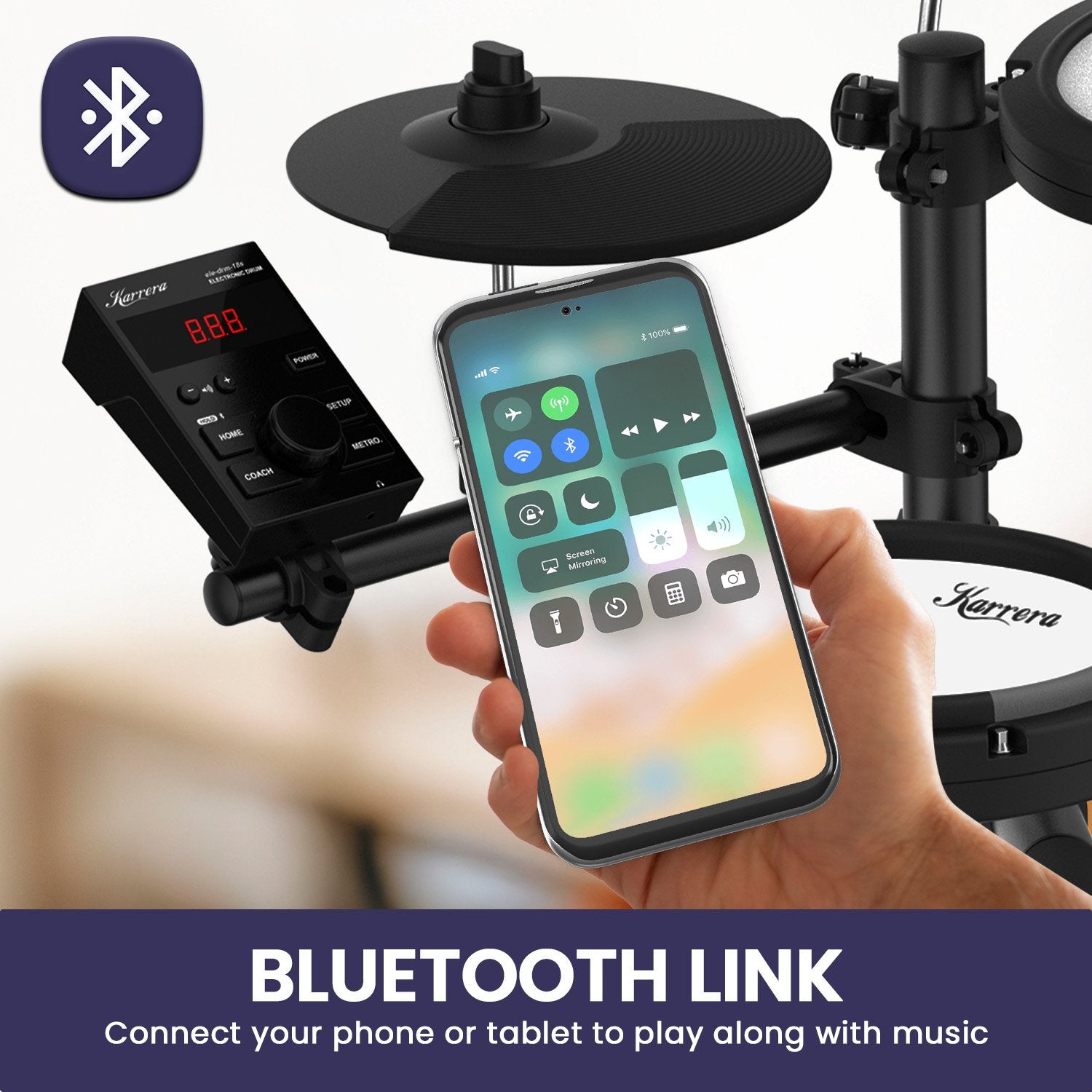 Karrera 18S Electronic Drum Kit Mesh Pads 8in Snare Bluetooth Sounds USB/MIDI Output Kick Pedals Drum Coach & Metronome