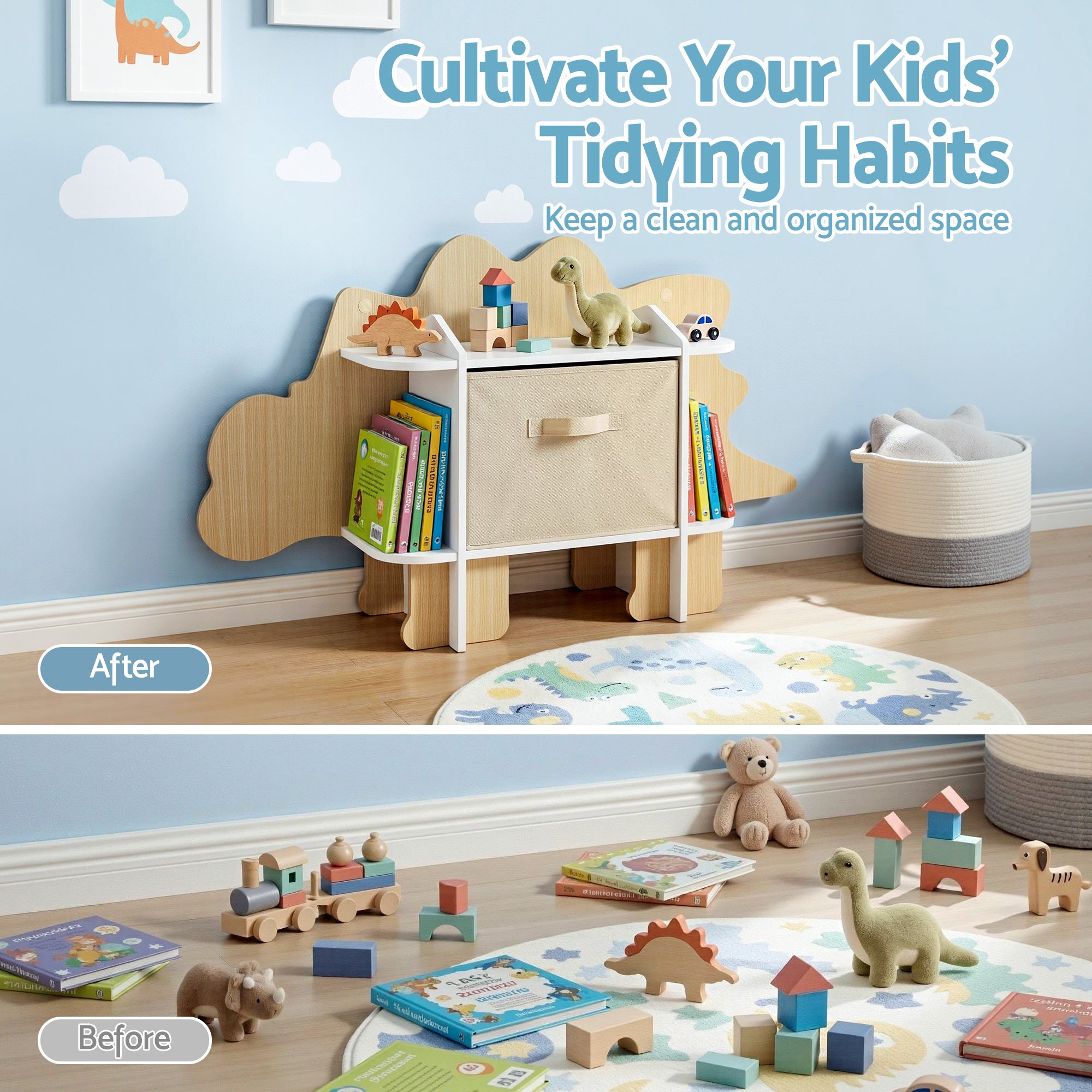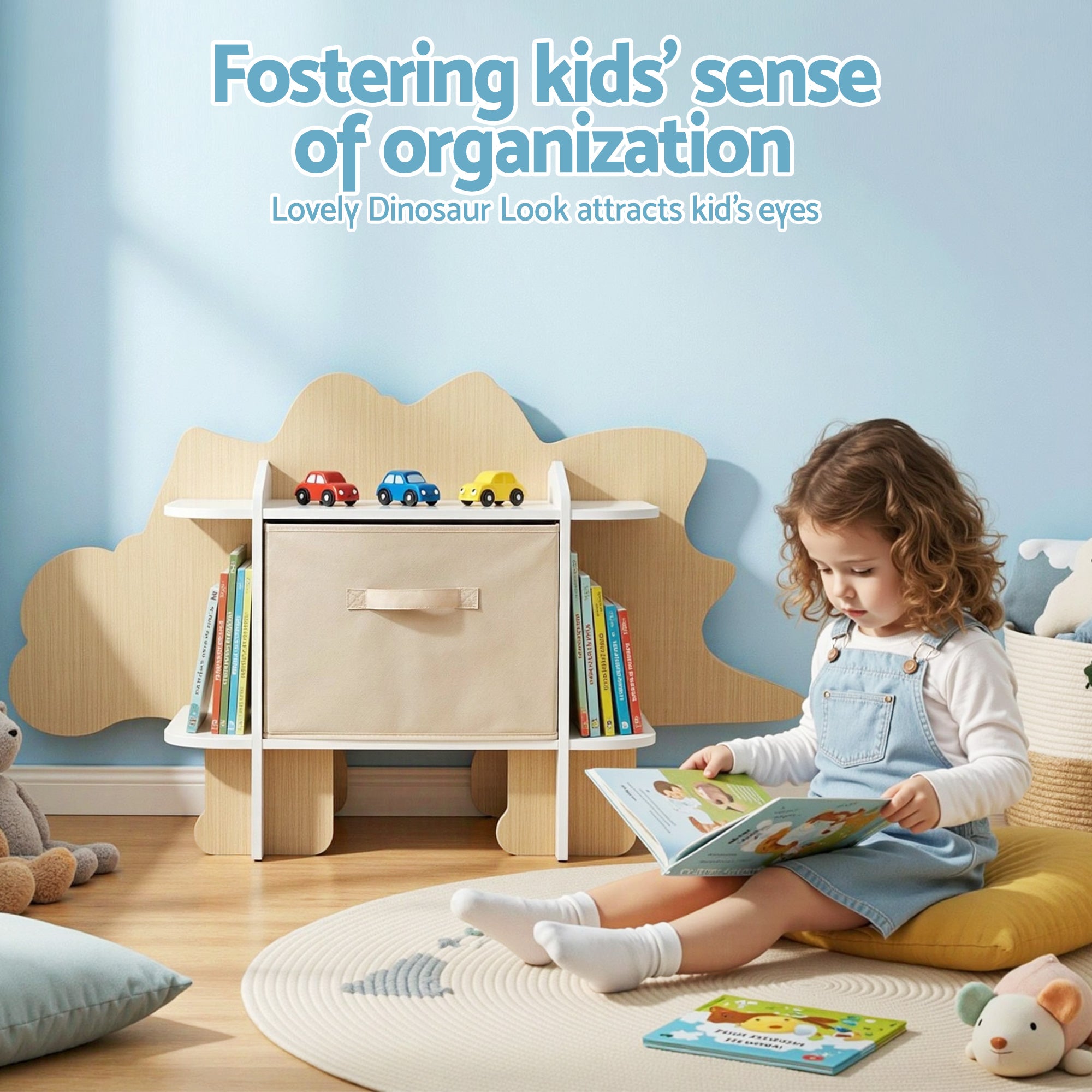 This dinosaur-shaped kids bookshelf is a fun and practical storage solution for children's bedrooms and playrooms. Designed with 2-tier open shelves and a fabric drawer, it keeps books and toys neatly organised while remaining easy for kids to access.