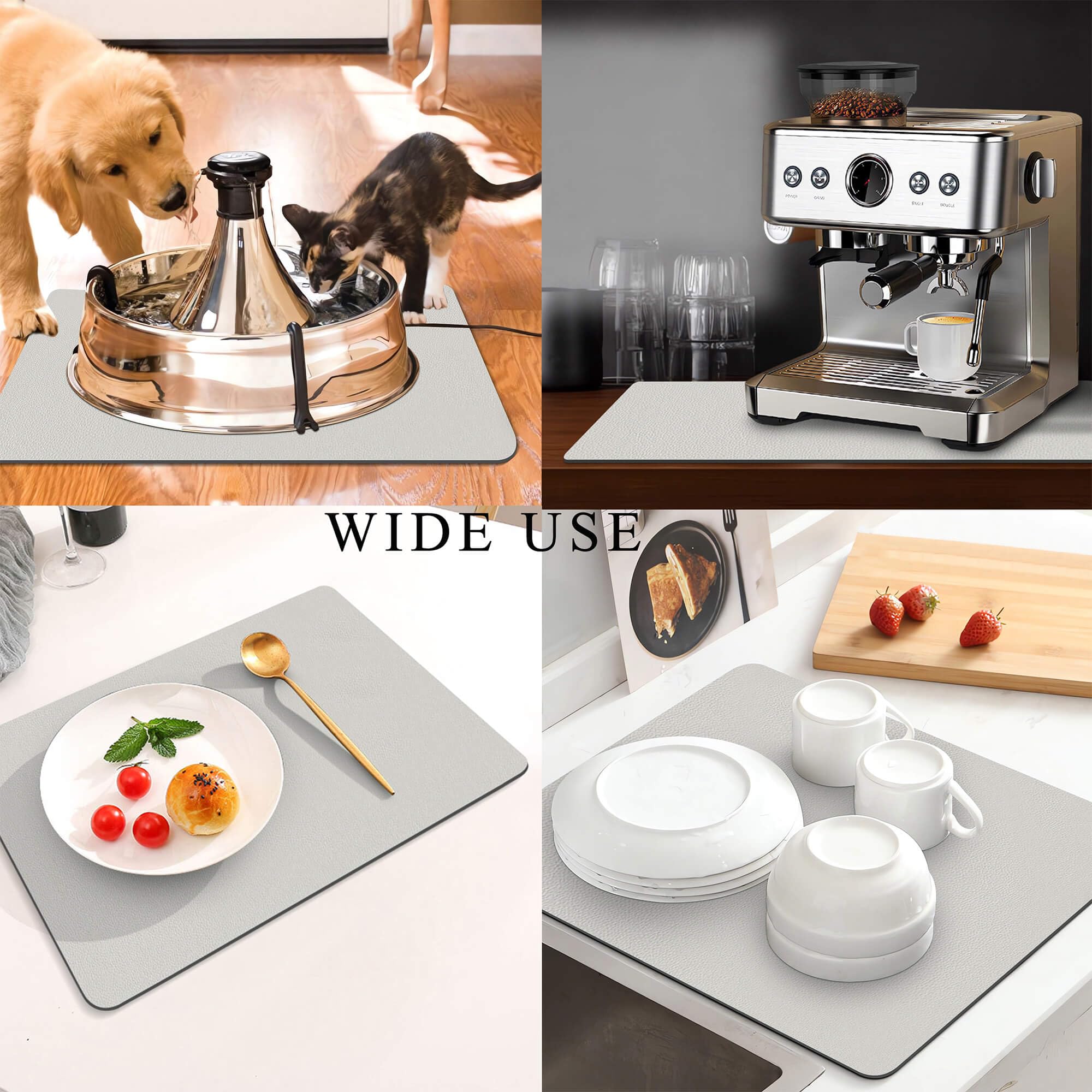 The mat features a non-slip natural rubber backing that securely holds appliances in place, reducing vibration and noise during operation. It also protects your countertop from scratches, heat damage, and moisture penetration. Thanks to its fast-drying properties, it keeps surfaces dry without leaving wet spots or lingering odors.