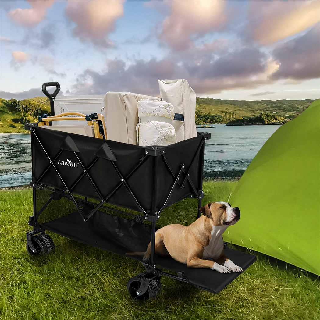 Double the space, double the fun! This Double-Decker Folding Wagon Cart is perfect for hauling everything—long gear like surfboards fit easily on the bottom layer, while the top handles your everyday stuff. With 360° swivel wheels, a 400L capacity, and 250kg weight limit. Whether it’s a trip to the beach, a BBQ, or just hauling gear around the backyard, this cart’s got you covered.Waterproof, durable, and easy to fold—no assembly needed. Ready to roll and go!