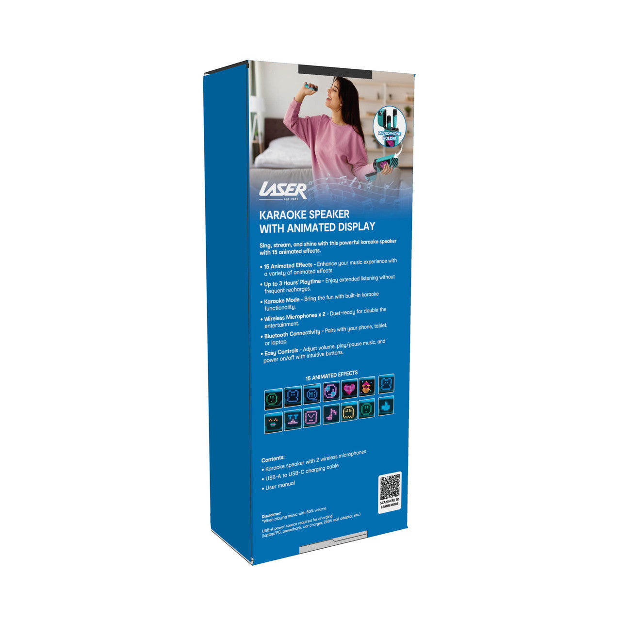 Sing, stream, and shine with the Laser Portable Karaoke Speaker Aquatic Awe powerful sound, dual wireless microphones, and a vibrant LED display come together for the ultimate entertainment experience.