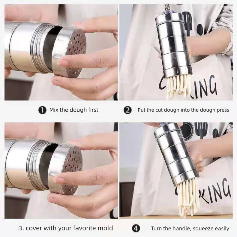 Made from high-quality stainless steel, this handheld noodle press features a robust cylindrical barrel and a T-shaped rotating handle that delivers smooth, consistent pressure. The included dies let you create a variety of traditional and modern noodle shapes—perfect for Chinese hand-pulled noodles, egg noodles, dumpling wrappers, or regional specialties like Hulao noodles. The cast iron screw rod enhances strength and stability during operation. Designed for ease of use, the machine can be fully disassembled for thorough cleaning after each use. Whether you're cooking for family or preparing meals in bulk, this tool simplifies fresh noodle making at home.