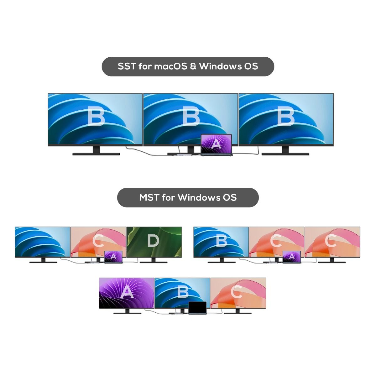 Note: Windows OS laptop supports MST (Mult-Stream Transport), which means that connecting two external monitors can display different contents.macOS laptop only supports SST (Single-Stream Transport) in USB-C Display Port (DP Alt-mode). The MacBook with an M1, M2 and M3 CPU currently only supports one external monitor display. Connecting two external monitors will only display duplicated contents.