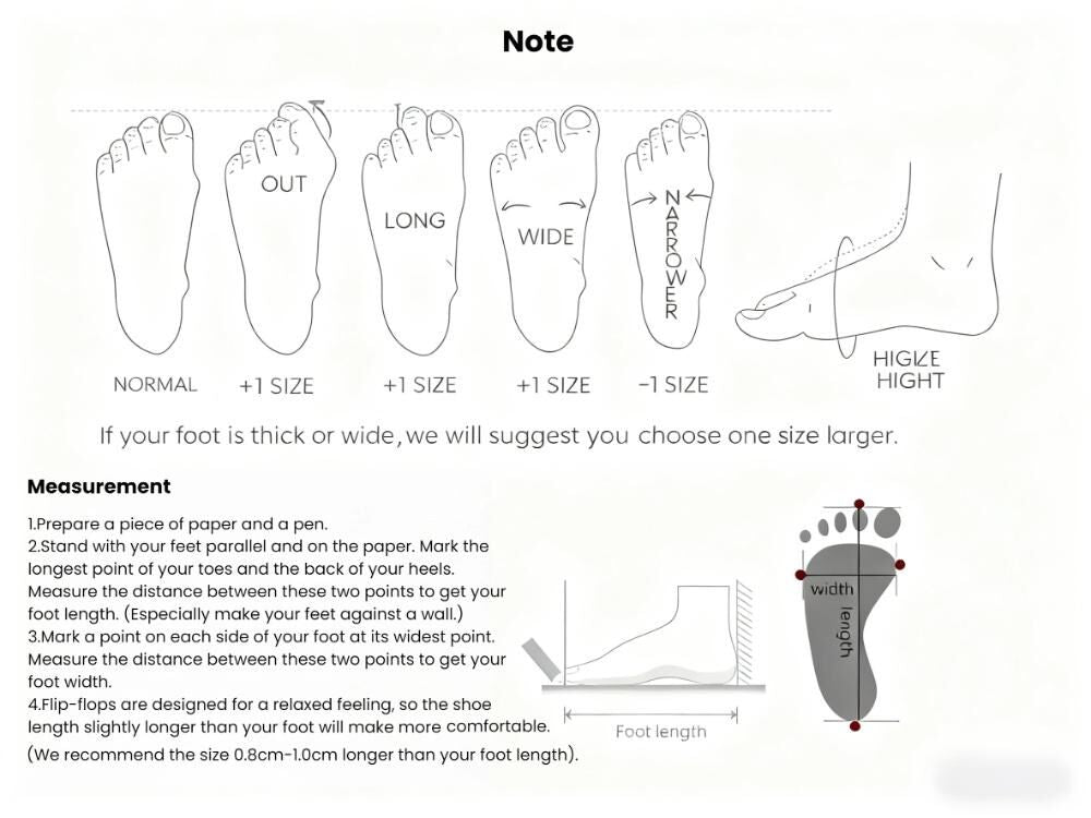 1. Size Selection: Measure your foot length accurately and refer to the size chart to choose the right size for a perfect fit. 2. Cleaning Instructions: Hand wash with mild soap and water; avoid harsh chemicals that may damage the sole materials. 3. Storage: Keep in a cool, dry place away from direct sunlight to prevent deformation or discoloration. 4. Usage Limitation: Not suitable for intense sports or activities that require heavy foot support. 5. Midsole Handling: Detach and reattach the midsole gently to avoid damage; ensure it's secured for best comfort and support. |