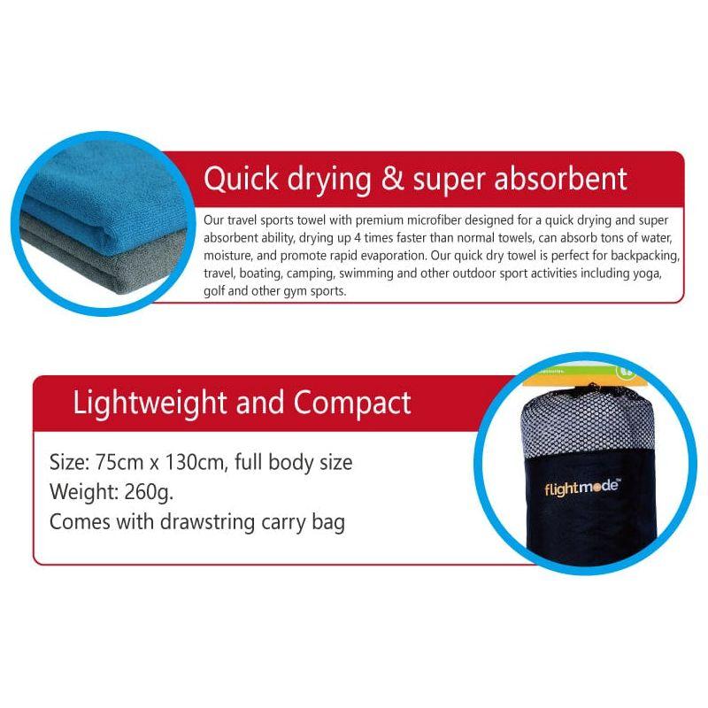 Lightweight, fast drying and compact, the Microfibre Travel Towel dries faster than a standard towel and is 1/8th the size of a standard towel, it comes with a drawstring carry bag.