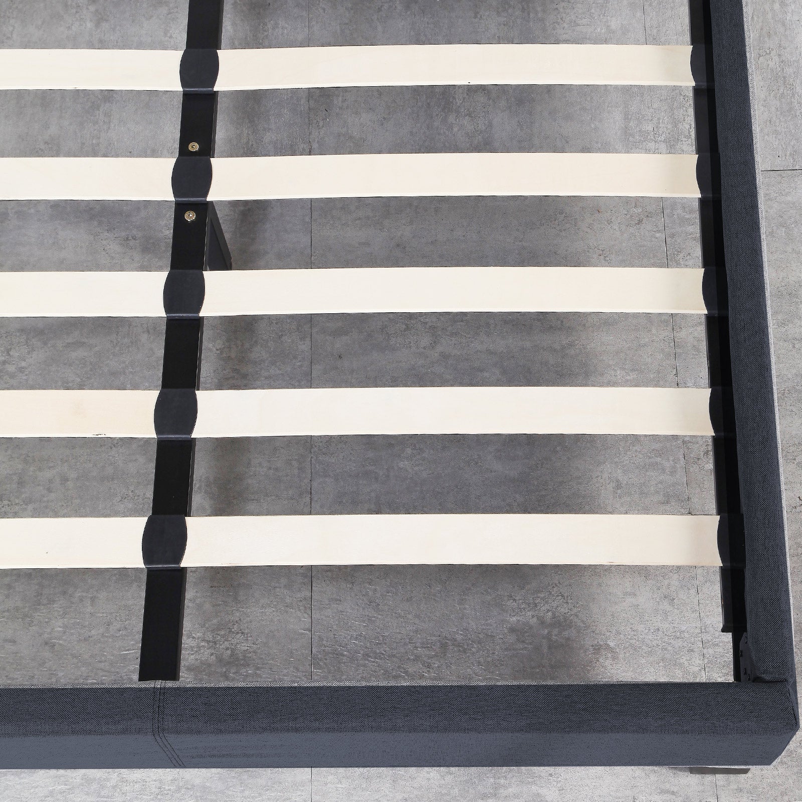 This bed frame and the complementary headboard is encased in a high-quality fabric upholstery with clean and smooth edges that complement the modern design and adds another layer of comfort to the bedroom experience.