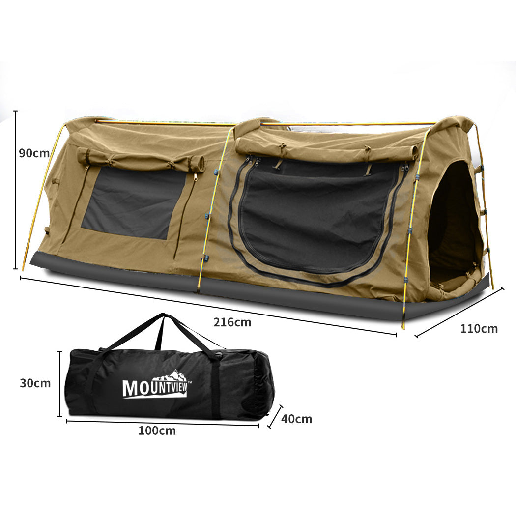 Explore more for outdoor living with Mountview free standing Swag Tent. 380GSM water-repellent rip stop canvas cover, 500gsm PVC flooring and an extra 10cm high edge, it is suitable for each season. Fully enclosed for privacy with zipped openings for fresh air anytime. Mesh panels allow fresh air in and keep insects out. A 60mm high density sponge mattress for better sleep on any surface. Thick aluminium support poles hold up the entire tent firmly. In addition, you will get inflatable pillows, pegs, guy ropes, carry bag and all the extras that make your camping experience unforgettable.