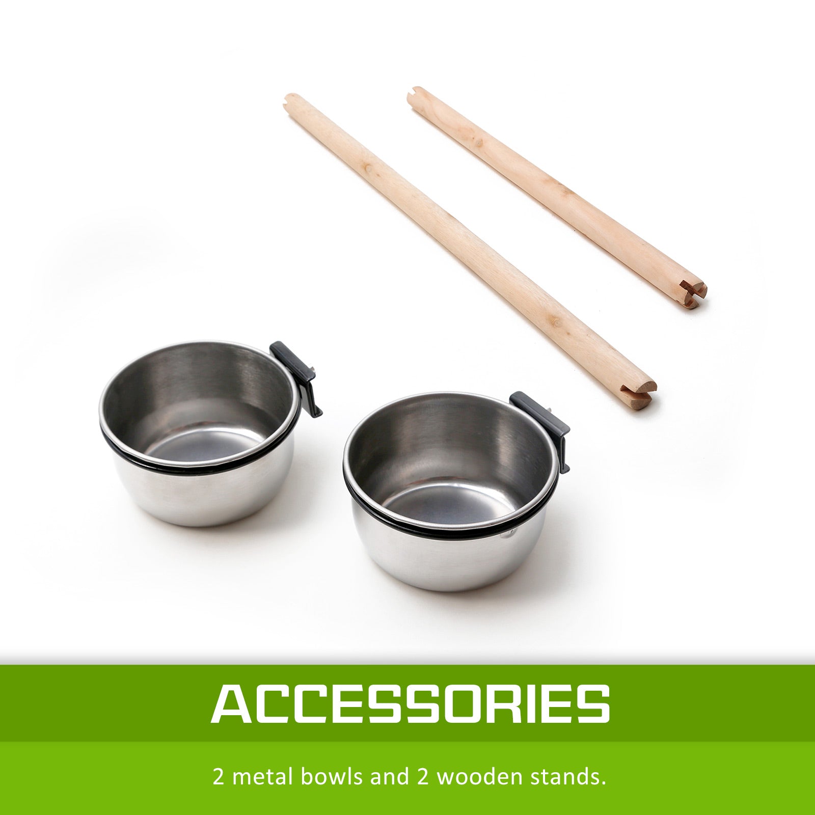 The cage's frame is made of durable and high-quality wrought iron and it is powder coated in order to prevent it from rusting and offer a longer service life. There is one lockable door on the front and one on the top of the cage so you can keep your bird safe and have easy access inside the cage. There is also a removable tray under in order to make cleaning easy. There are four, 360 degree swivel caster plastic wheels so relocating the birdcage is very easy. 2 water/food container and 2 rest wooden perches are included. The cage also has a clever shelf under it so you can store your birds' needs, such as water, food and cleaning tools. Another good feature is that the bird dome on top is removable from the stand so you can place it on top of tables or other places.