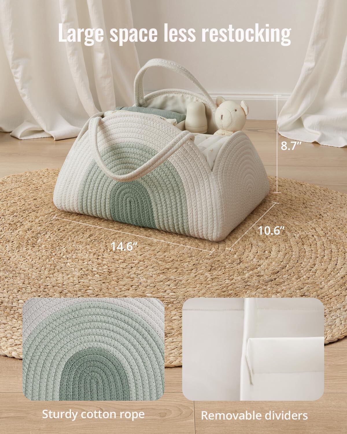 Portable Cotton Rope Diaper Caddy Large Baby Storage Basket with Removable Dividers and Handles for Nursery, Car, Travel Stylish Organizing Bin for Newborn Essentials (Mint Rainbow)