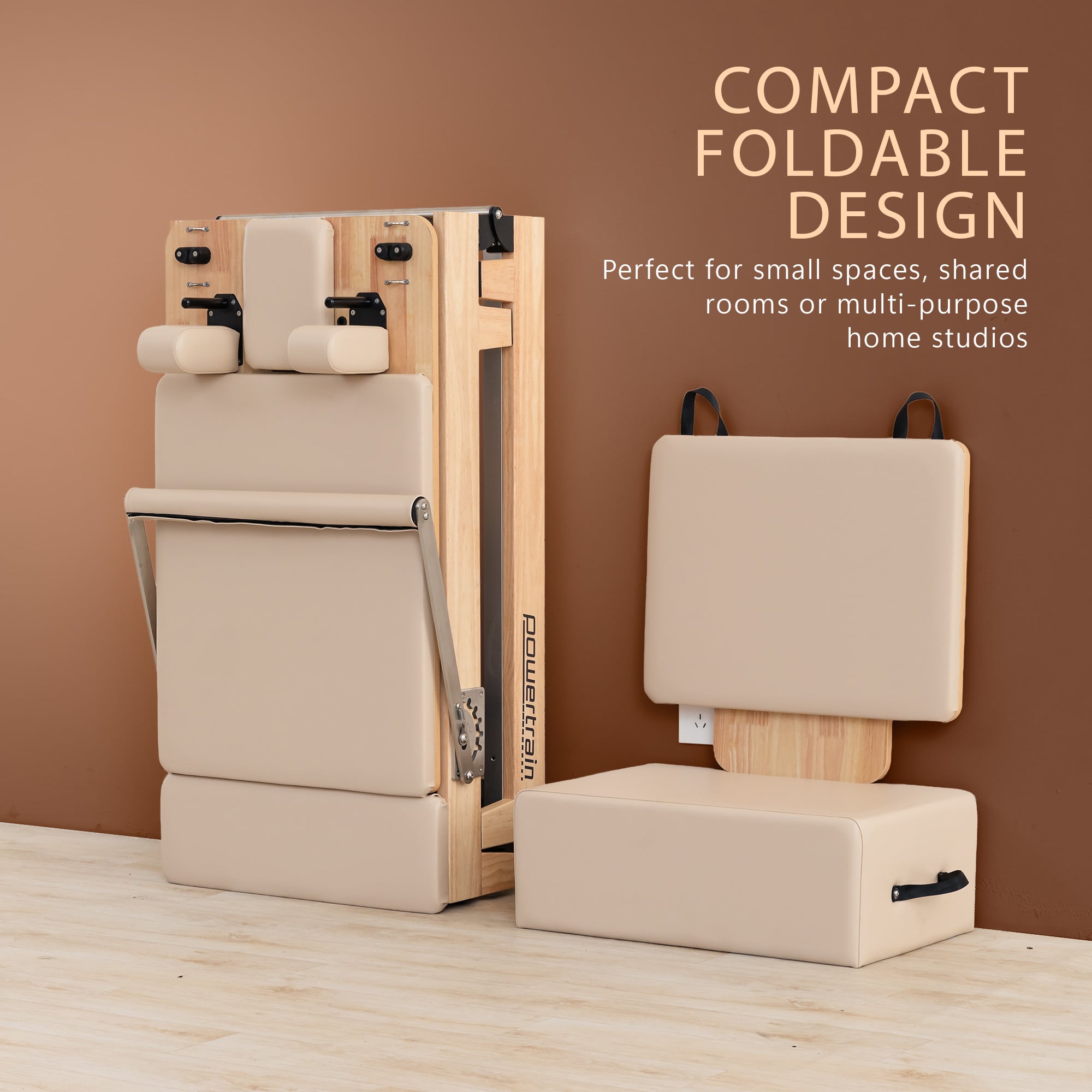 Powertrain Selina Pilates Reformer Machine Wooden Folding Multifunctional Home Gym Equipment with Jumpboard & Sitting Box Oak Beige
