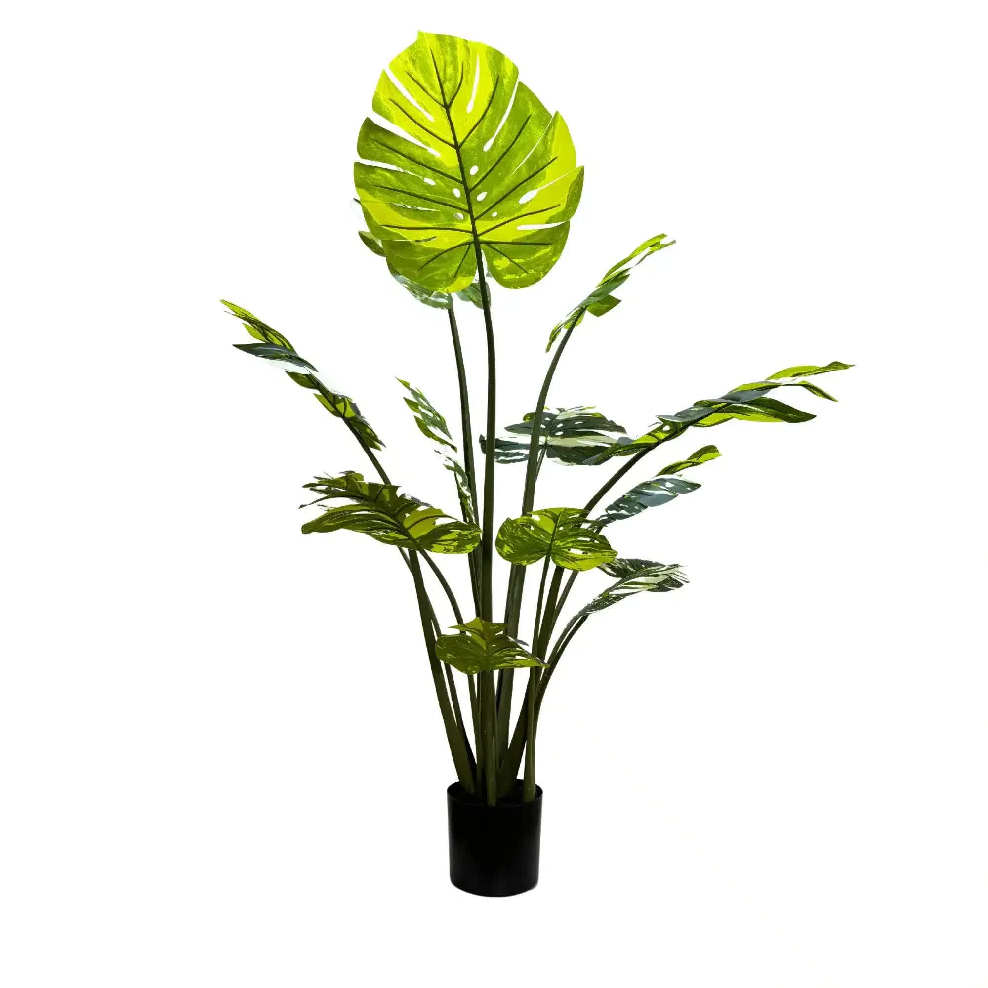 Introducing the Luxe Foliage Artificial Plant a towering 150cm (nearly 5 feet) of lush, vibrant greenery to elevate your space without the need for a green thumb. This faux botanical masterpiece is a blend of variegated monstera and palm leaves, designed to bring the essence of the tropics into your home or office. The plant comes nestled in a simple, stylish black pot, ready to display.