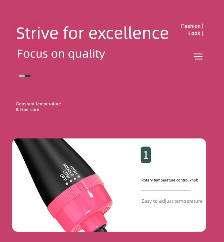 Engineered for performance and comfort, this hot air brush features a sleek black and pink finish with a durable rubberized coating for enhanced grip. The round barrel design with soft bristles helps detangle and smooth hair while delivering even heat distribution. The internal heating element uses a new-generation heating wire that maintains consistent temperature output, minimizing damage from overheating. With LED indicator lights and a compact size, it's perfect for travel and daily use. The 2-meter power cord ensures flexibility, while the ergonomic shape supports extended use without discomfort.